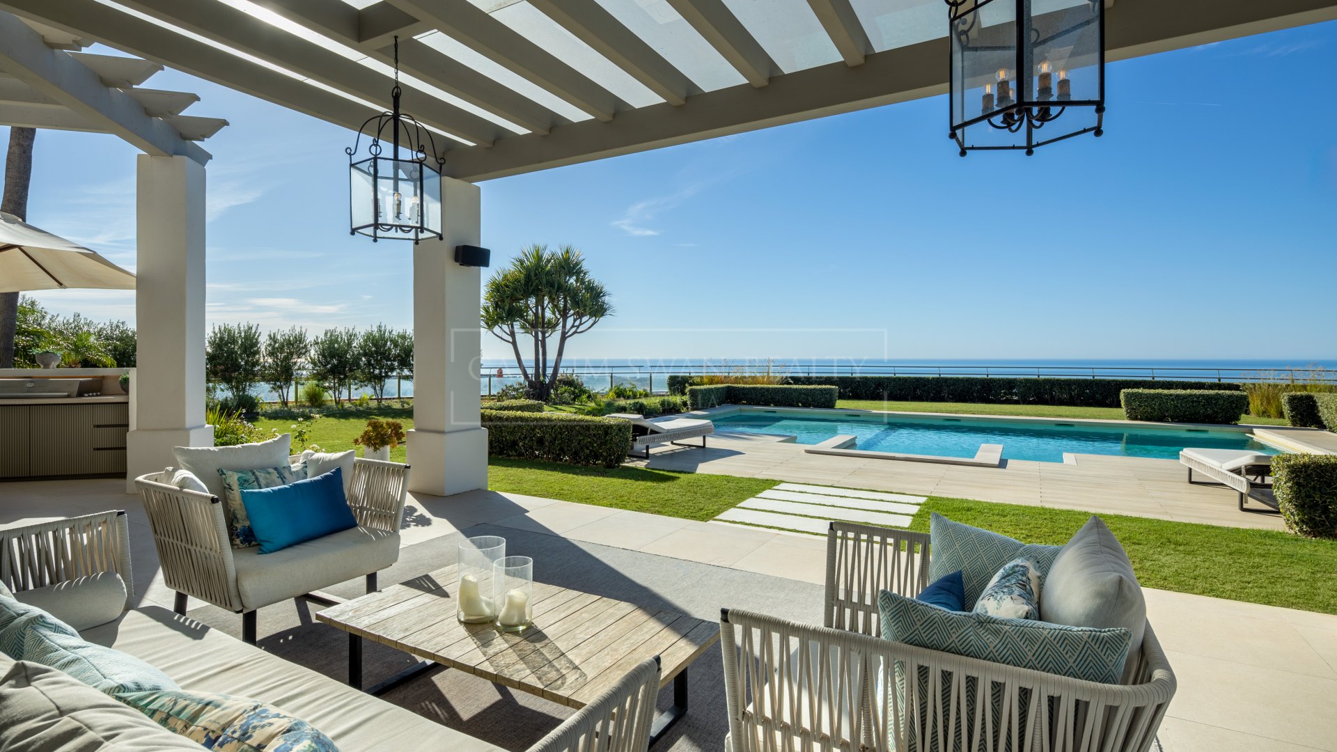 The exterior offers several semi-covered lounge areas, an outdoor dining space with a fitted kitchen, and a landscaped garden with a swimming pool and sunbathing area, all enjoying open views of the sea and mountains.