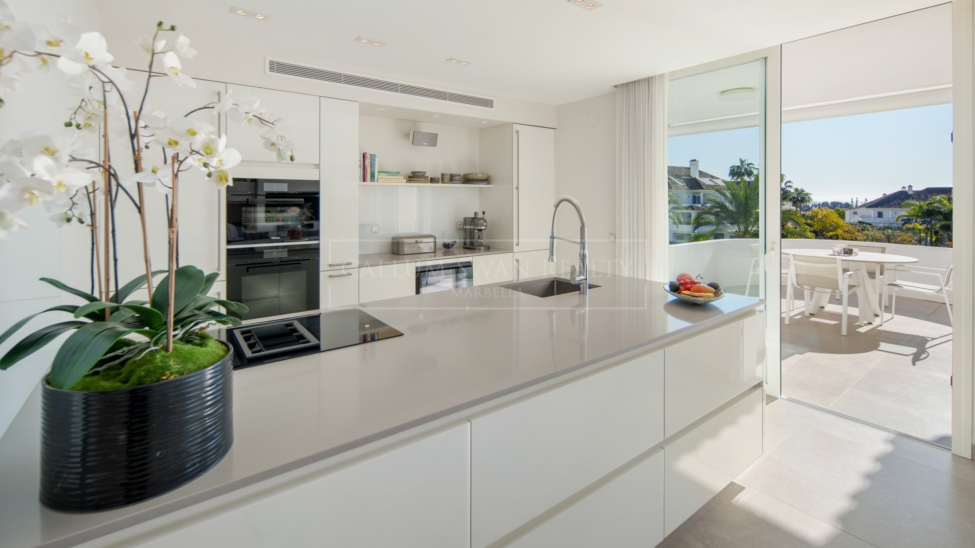 The terraces extend directly from the living area and include covered sections suitable for dining and seating throughout the year. The dual orientation allows for flexible use at different times of day, with open views across the surrounding residential area, gardens and towards the coastline.