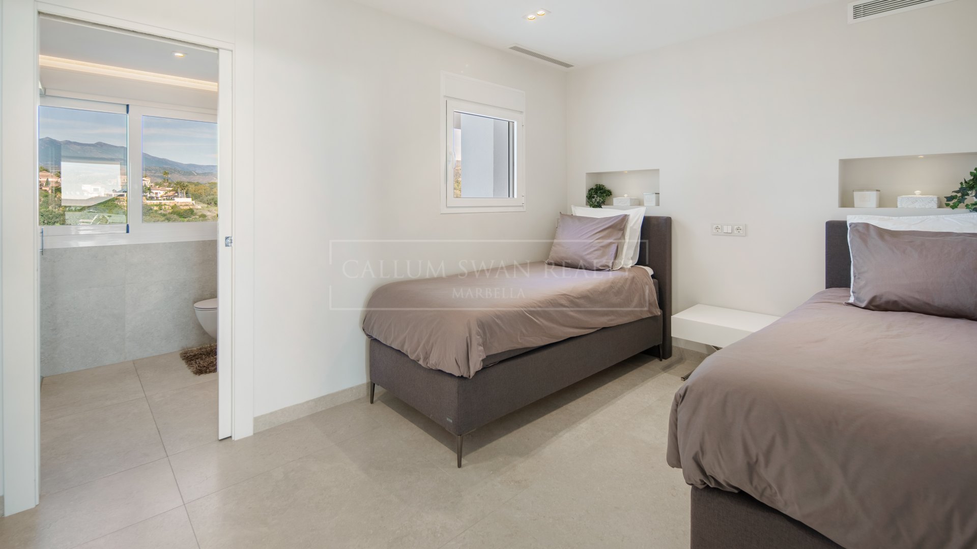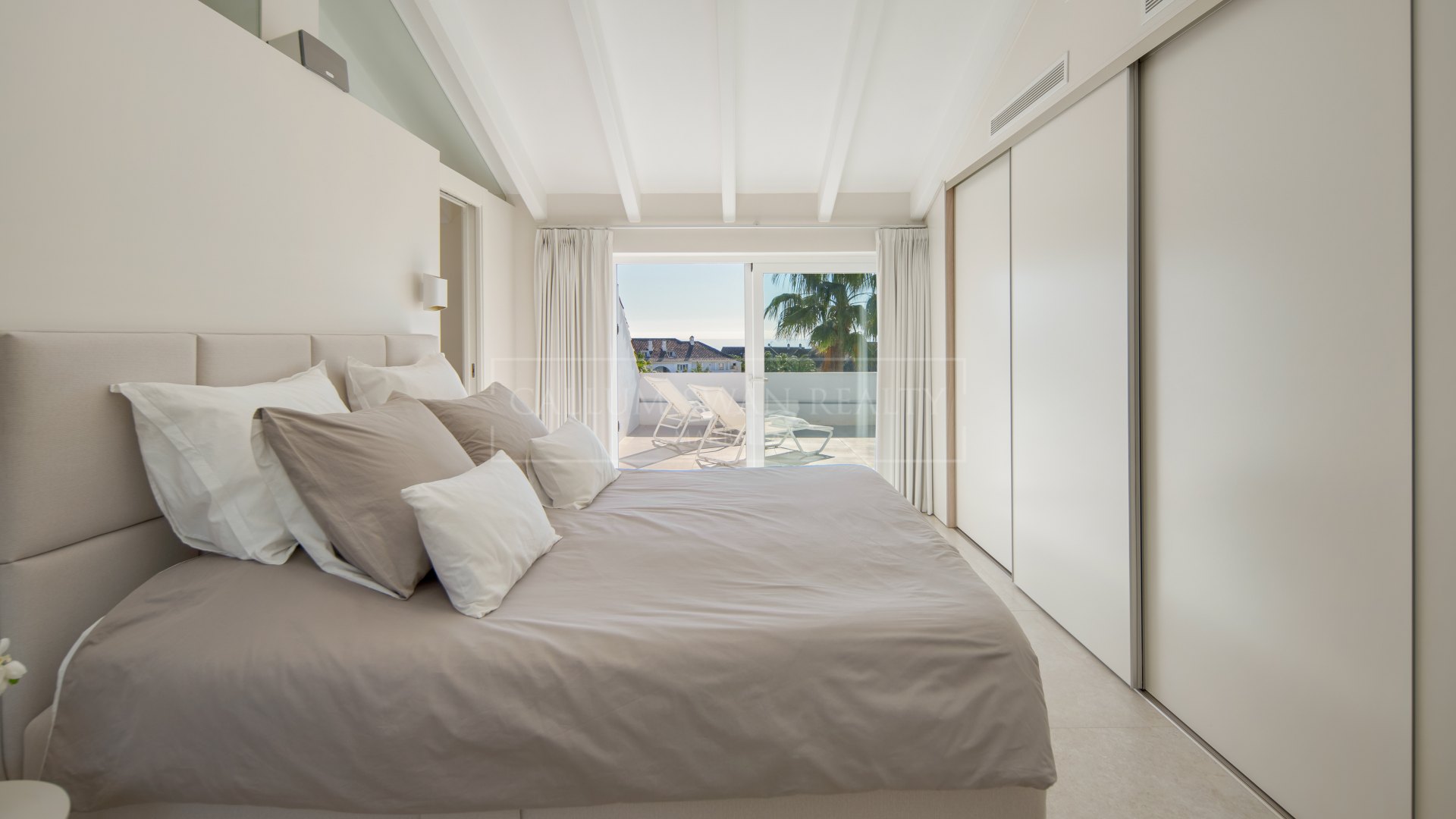 The upper level is dedicated to the principal bedroom suite, which includes an en-suite bathroom and access to a private terrace with elevated views and added privacy.