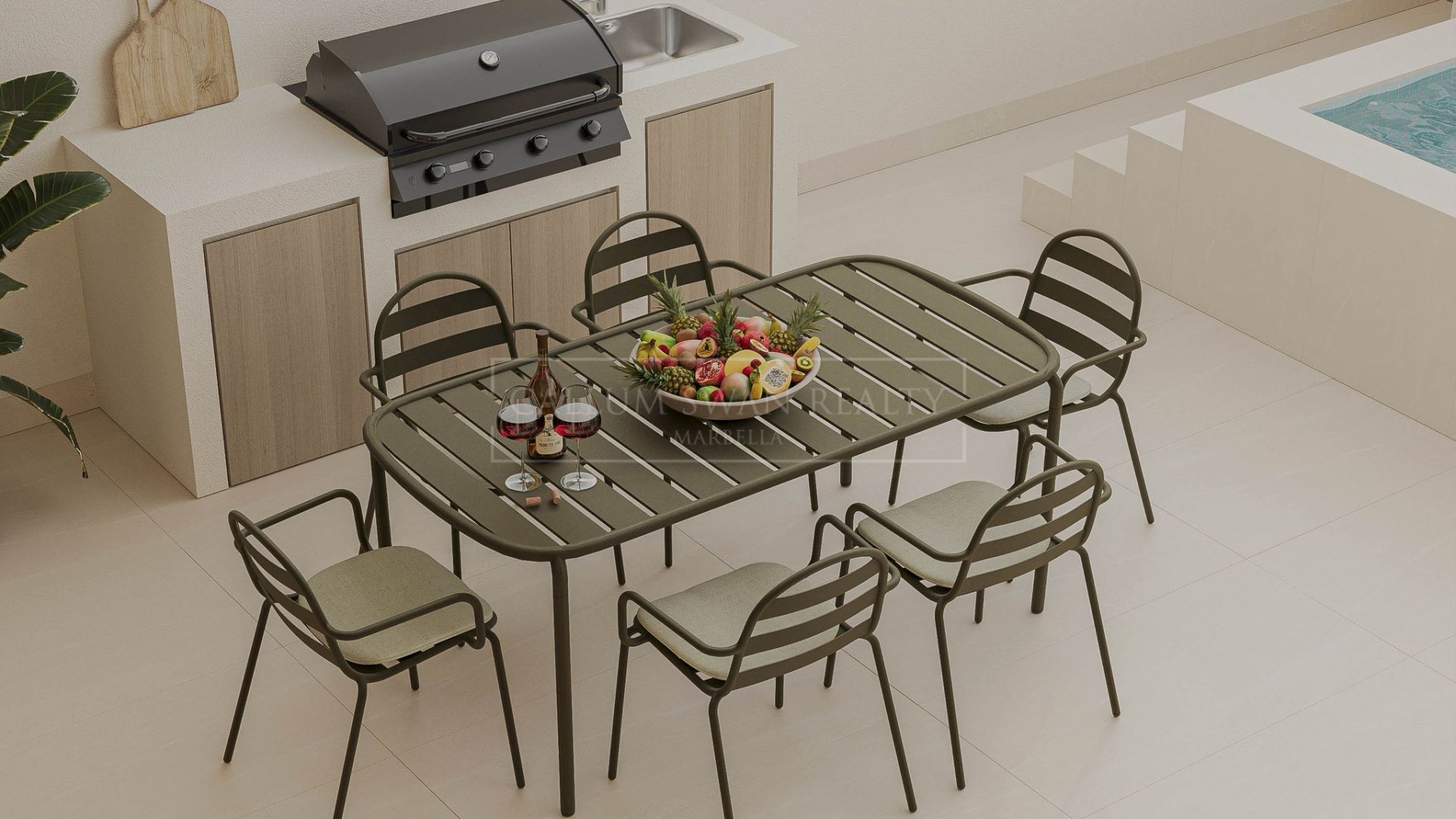 Distributed over two levels, the house offers an open-plan interior design that combines elegance and practicality. On the ground floor there is a spacious living area with an integrated modern kitchen, fully equipped with top-of-the-range appliances and a central island. The living room, bright and spacious, has direct access to a partially covered terrace with an outdoor kitchen, complete with integrated grill and wine fridge. The beautiful alfresco dinning area is further enhanced by a private heated pool and shower, perfect for all year enjoyment. This level also includes a further guest bedroom, bathroom and dedicated laundry facility. The upper floor consists of the main bedroom with an en-suite bathroom featuring double walk-in shower, walk-in closet and dressing area and private terrace, as well as two additional guest bedrooms sharing a bathroom. The house is completed with private parking for two cars and pre-installation for an electric vehicle charger.
