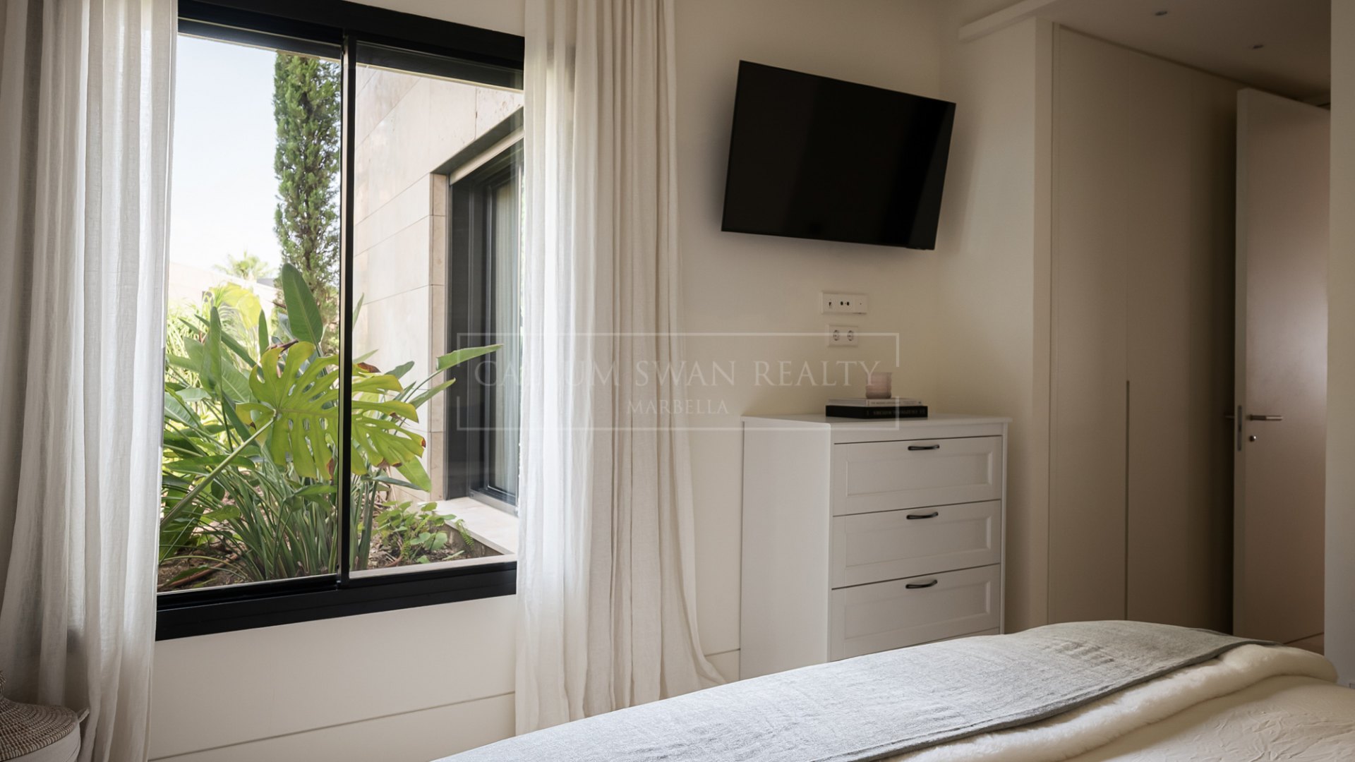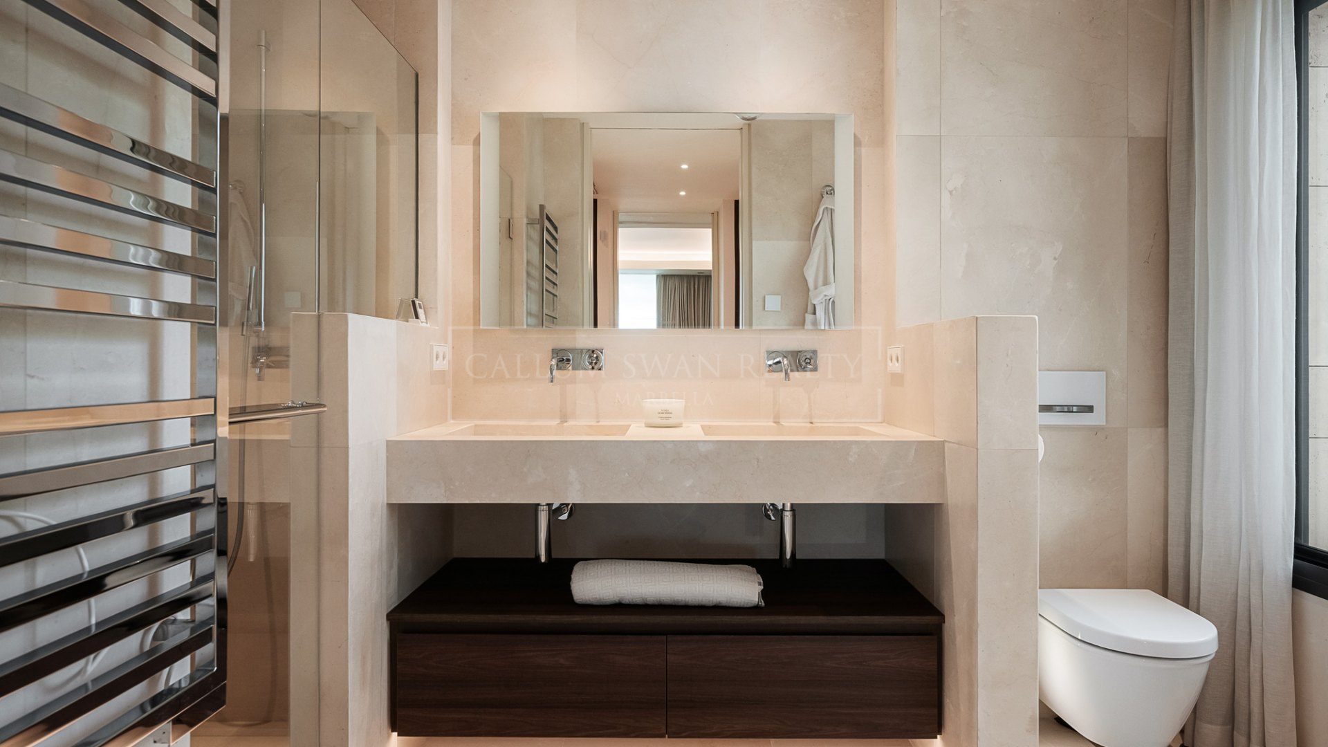 El ala privada comprende tres dormitorios. La suite principal incluye vestidor y baño en suite con acceso directo a la terraza, mientras que los dos dormitorios de invitados adicionales también disponen de baños en suite. Un lavadero separado y un aseo de cortesía se encuentran en el pasillo para mayor practicidad.