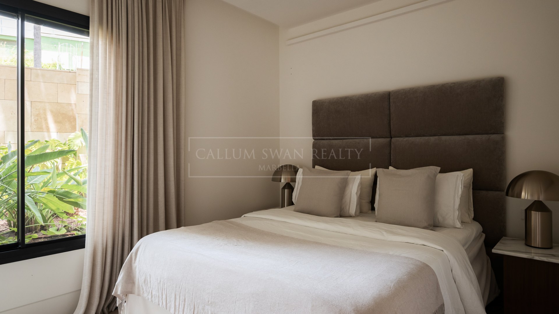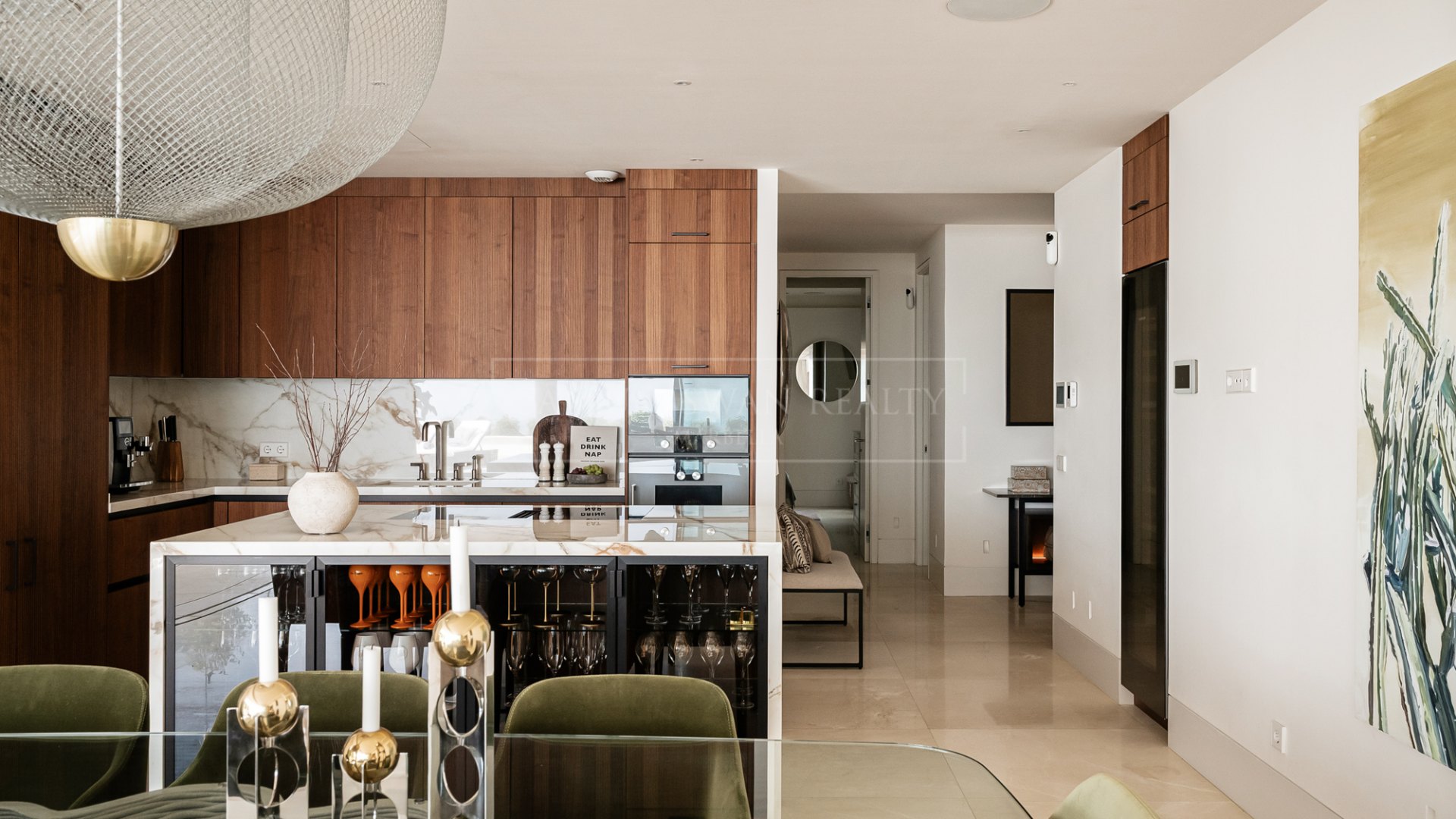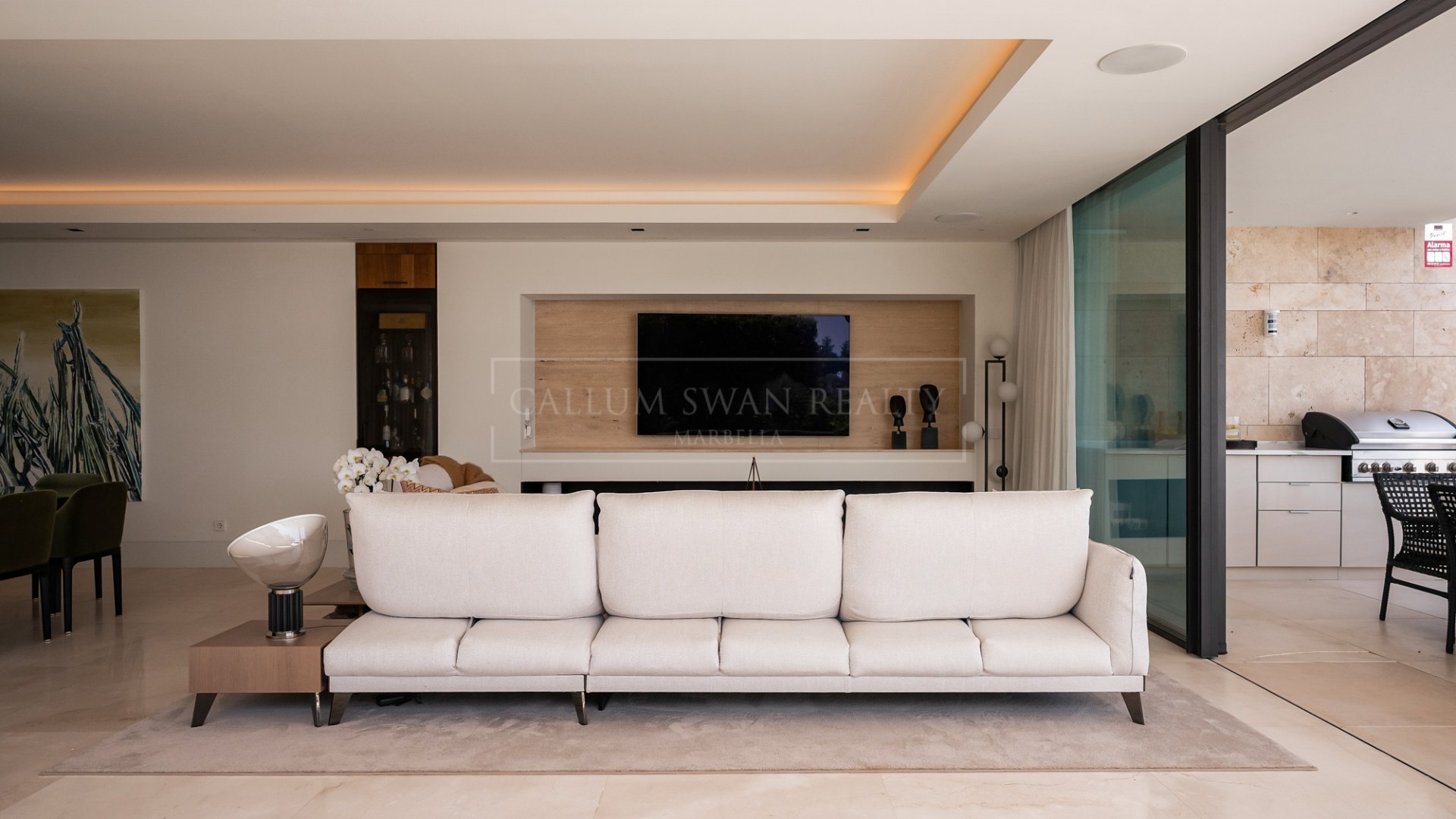 La propiedad está distribuida en una sola planta. Un vestíbulo separa las áreas de estar y descanso. El salón-comedor de planta abierta cuenta con grandes puertas correderas de cristal, que permiten la entrada de luz natural y brindan acceso directo a la terraza. La cocina está totalmente equipada con electrodomésticos integrados de las marcas Gaggenau y Miele, e incluye una isla central con una distribución práctica que conecta tanto con el comedor como con las áreas exteriores.