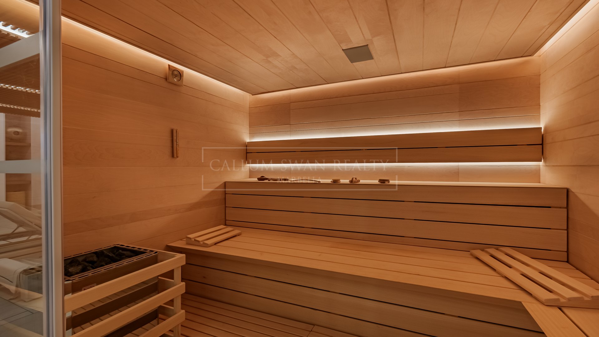 El nivel inferior está dedicado al bienestar y al entretenimiento, con un gimnasio, sala de yoga, zona de spa con piscina cubierta, sala de masajes, sauna y baño turco, cine en casa, bodega y sala de juegos con bar. Una lavandería y un dormitorio adicional para invitados con baño en suite completan este nivel.