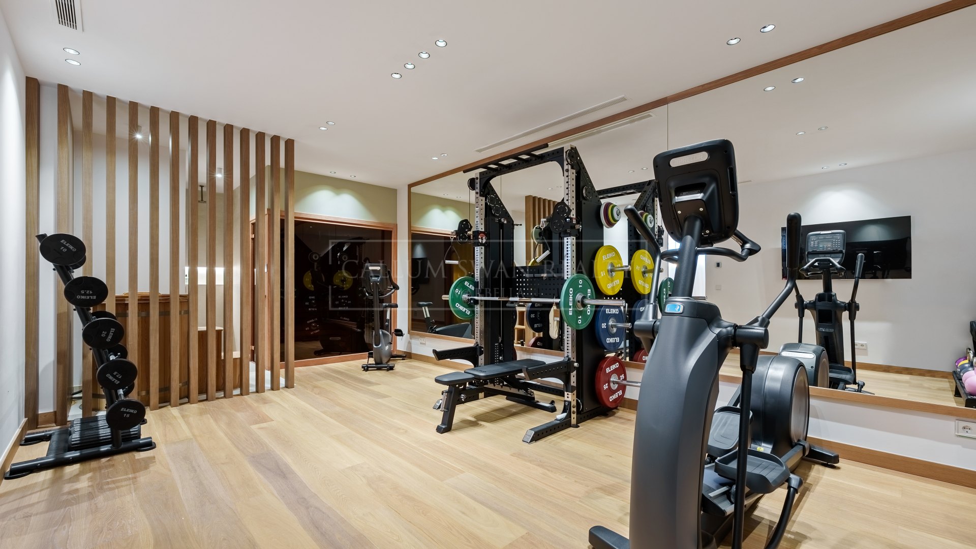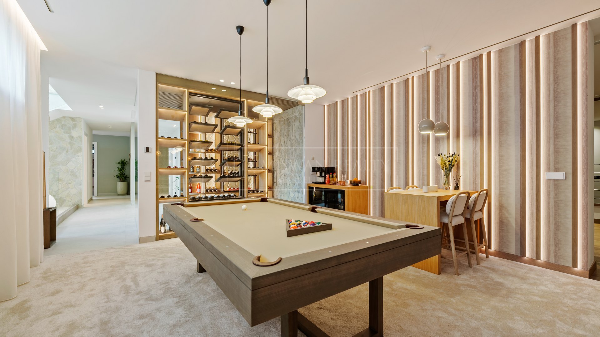 El sótano ofrece instalaciones de ocio y servicios prácticos, incluyendo una gran sala de entretenimiento, un gimnasio con sauna, una bodega y dos dormitorios de invitados que comparten un baño. Estos dormitorios tienen acceso a una terraza compartida que conecta con la terraza de la cocina exterior. Este nivel también incluye áreas de almacenamiento, un cuarto de lavado y un garaje para varios vehículos.