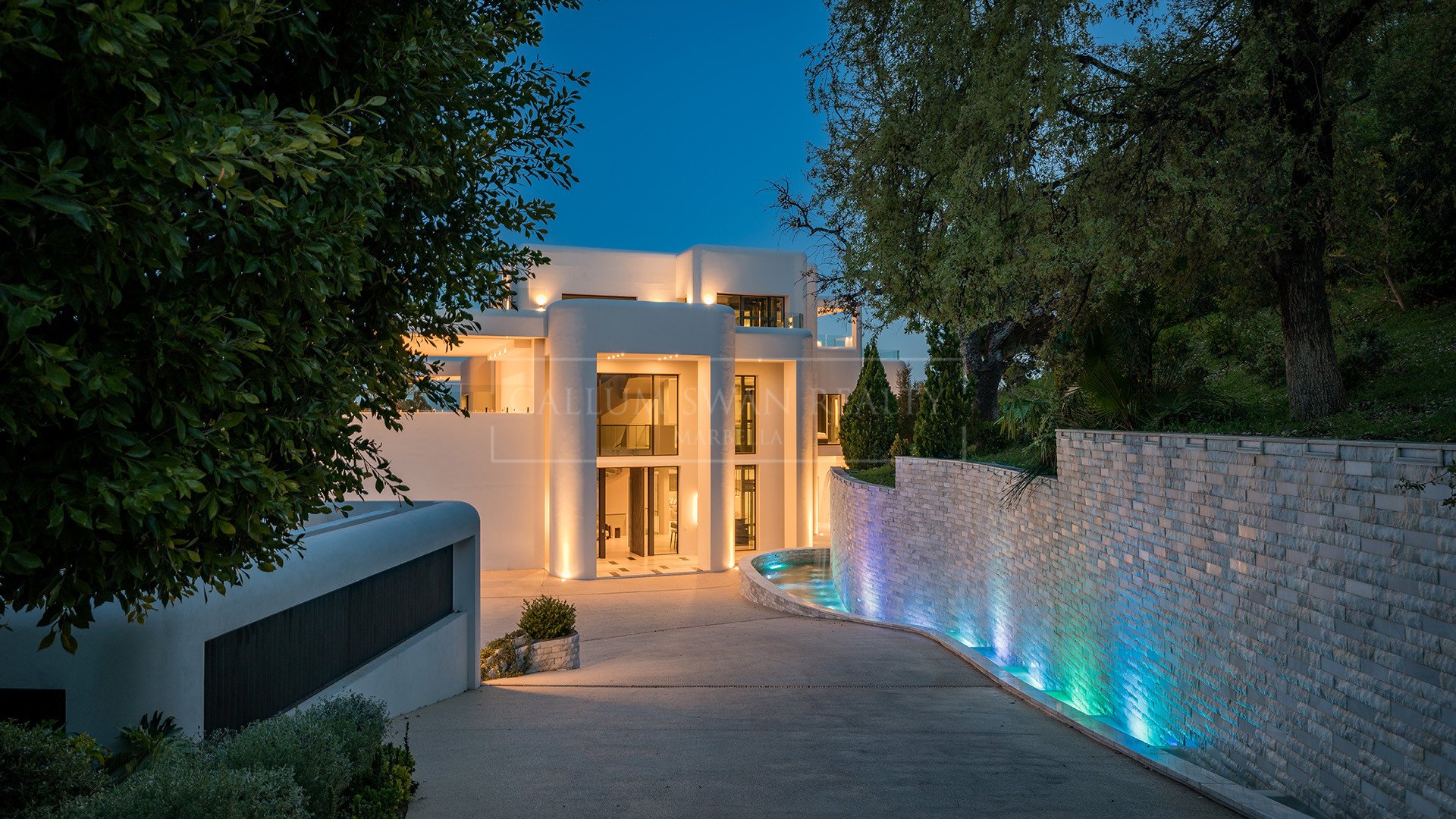 Entre las características más destacadas se incluyen un ascensor privado a todos los niveles, llamativas paredes de ónice azul verdoso en los baños y la zona de spa, y una cochera para seis coches. Los ventanales de toda la villa llenan la casa de luz natural y ofrecen vistas al mar o a la montaña desde casi todas las habitaciones.