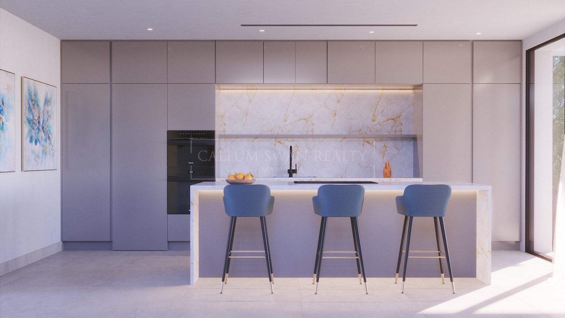 La villa de tres niveles está en construcción y está prevista su finalización para finales de 2026. El proyecto ha sido diseñado para integrar la arquitectura con el paisaje circundante mediante una planificación cuidadosa, materiales y tecnología moderna. La planta baja ofrece un área de salón y comedor de concepto abierto con una cocina totalmente equipada con electrodomésticos Miele. Los techos altos y los grandes ventanales correderos maximizan la luz natural y se abren al exterior. Este nivel también incluye un dormitorio de invitados con baño en suite, un lavadero y un aseo para invitados.