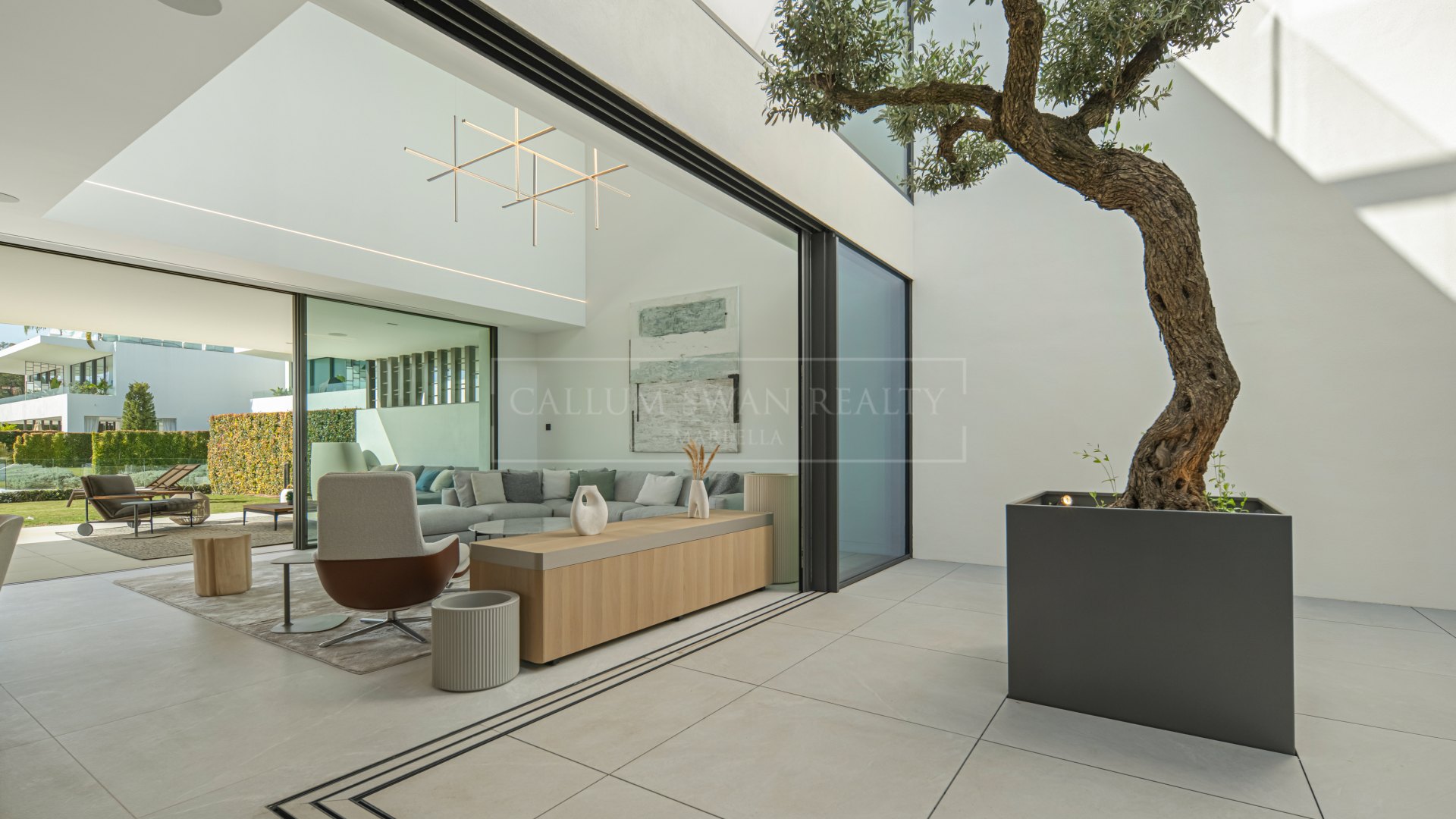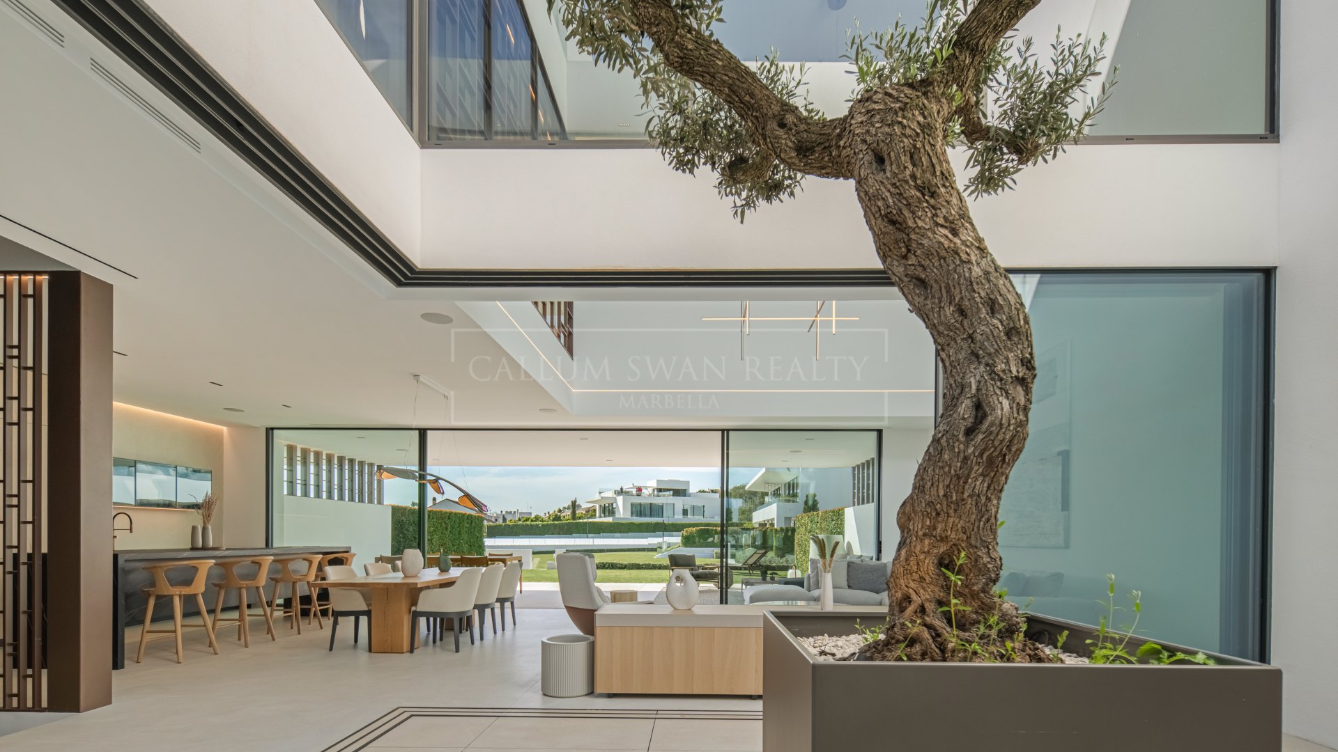 La villa está distribuida en cuatro niveles. La planta baja consta de un espacio abierto para el salón y el comedor con una cocina totalmente equipada, diseñado para la vida diaria práctica y el entretenimiento. Un patio interior con un olivo maduro cerca de la entrada aporta luz natural al interior. Desde el salón, puertas correderas de altura completa se abren hacia una terraza cubierta, creando una conexión directa con el jardín privado. Las áreas exteriores en este nivel incluyen espacio de jardín ajardinado y una terraza adecuada para comer y relajarse, con acceso a la piscina comunitaria.