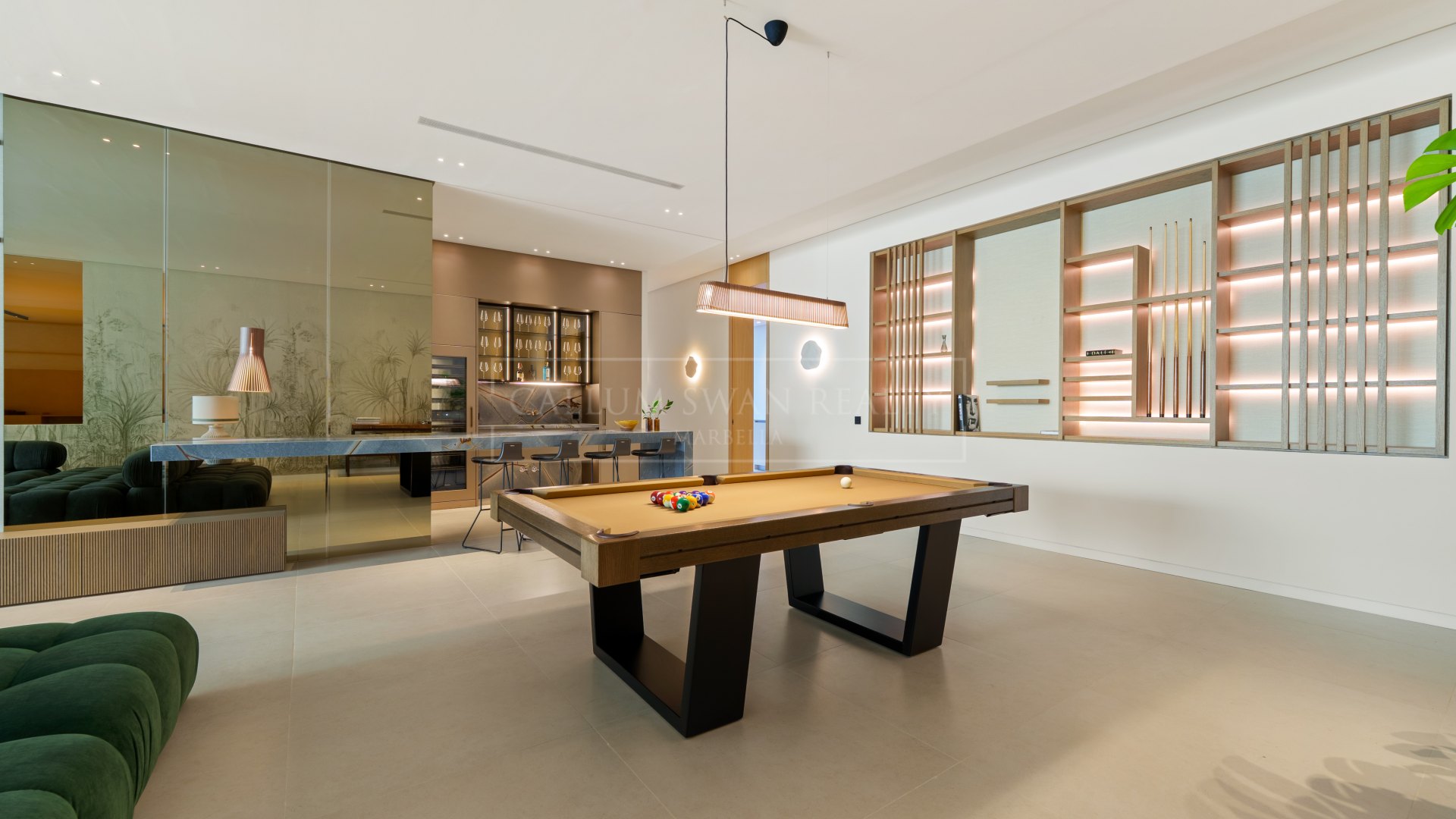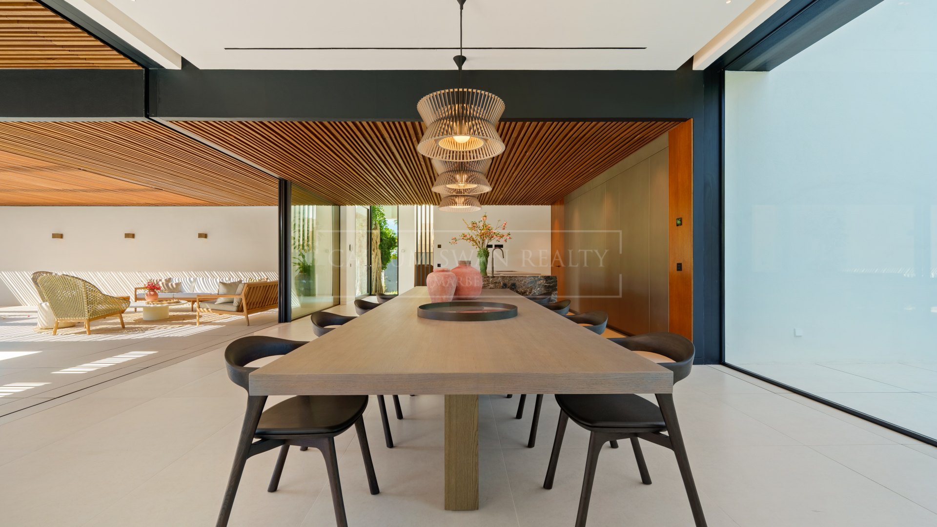 Diseñada en tres niveles, la villa incluye características modernas, interiores elegantes y comodidades de primera calidad. La planta baja ofrece un espacio diáfano con una cocina totalmente equipada con techo de paneles de madera, un comedor y dos salones separados por una chimenea. Las amplias puertas correderas de cristal abren el espacio a la terraza y al jardín, mientras que este nivel también alberga un dormitorio de invitados con baño y un aseo.