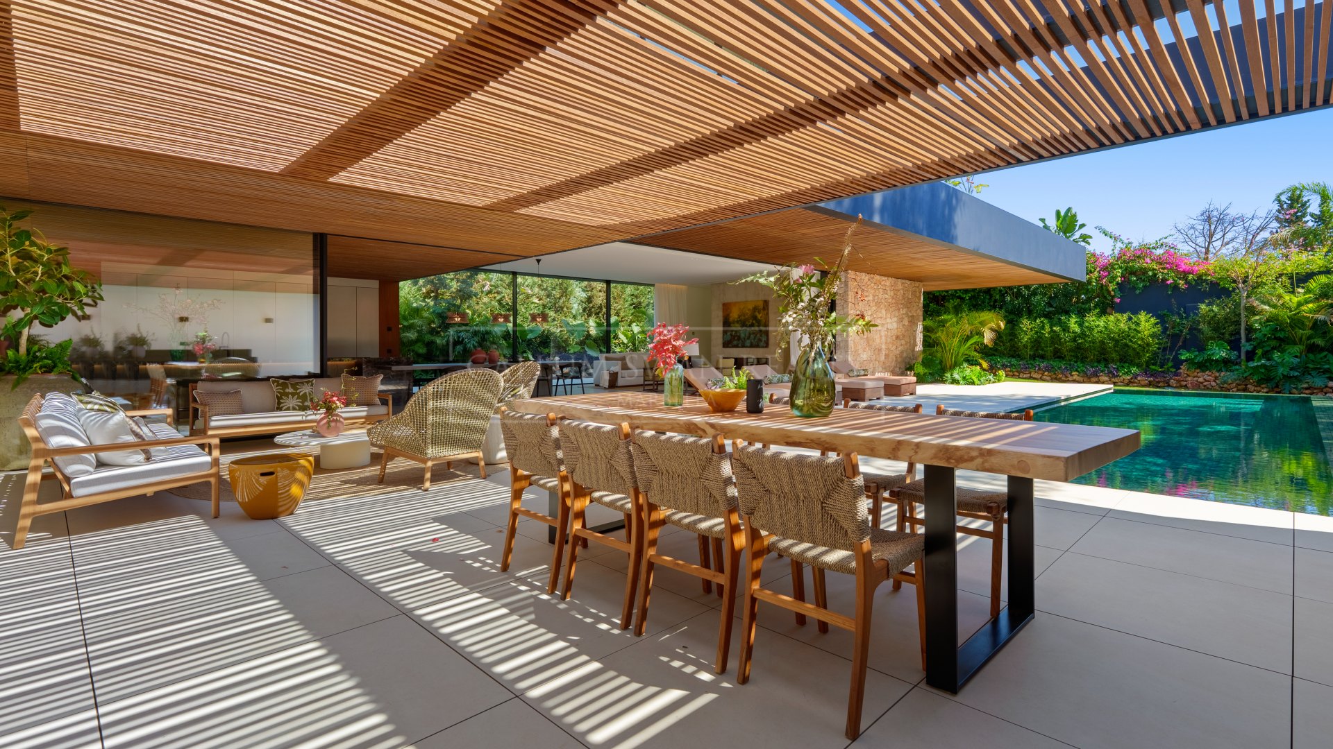 En el exterior, los paneles de madera se extienden desde el interior para crear una terraza sombreada con comedor, salón y tumbonas. Una piscina infinita fluye hacia los jardines paisajísticos, lo que aumenta la sensación de espacio y privacidad de la vivienda.