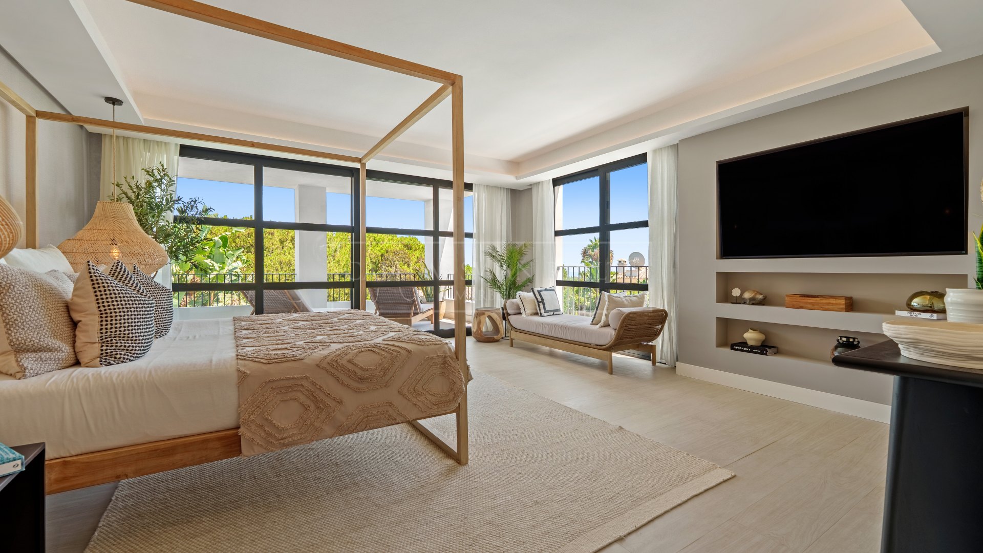 La primera planta está dedicada al dormitorio principal, diseñado con techo abovedado, gran vestidor, baño en suite con bañera independiente y terraza privada con zona de descanso y vistas a la montaña de La Concha.