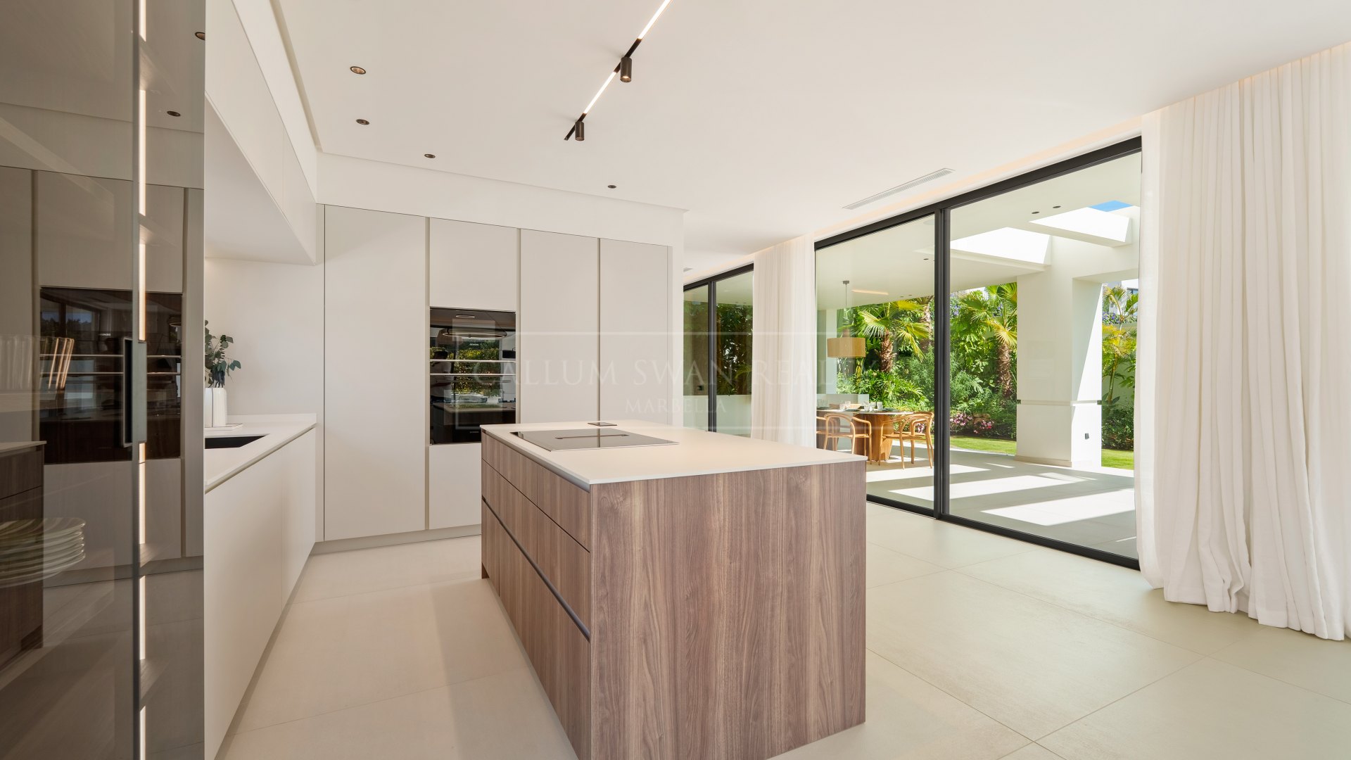La villa está distribuida en tres niveles y proporciona un espacio generoso para la vida familiar y el entretenimiento. La planta baja se centra en una luminosa zona de estar y comedor de concepto abierto que se conecta con una cocina moderna con isla. Desde la zona de estar, grandes puertas correderas de cristal se abren a una terraza cubierta con un salón y comedor al aire libre, que conduce a una terraza de madera para tomar el sol, piscina y un jardín paisajístico, ideal para el disfrute diario o para recibir invitados.