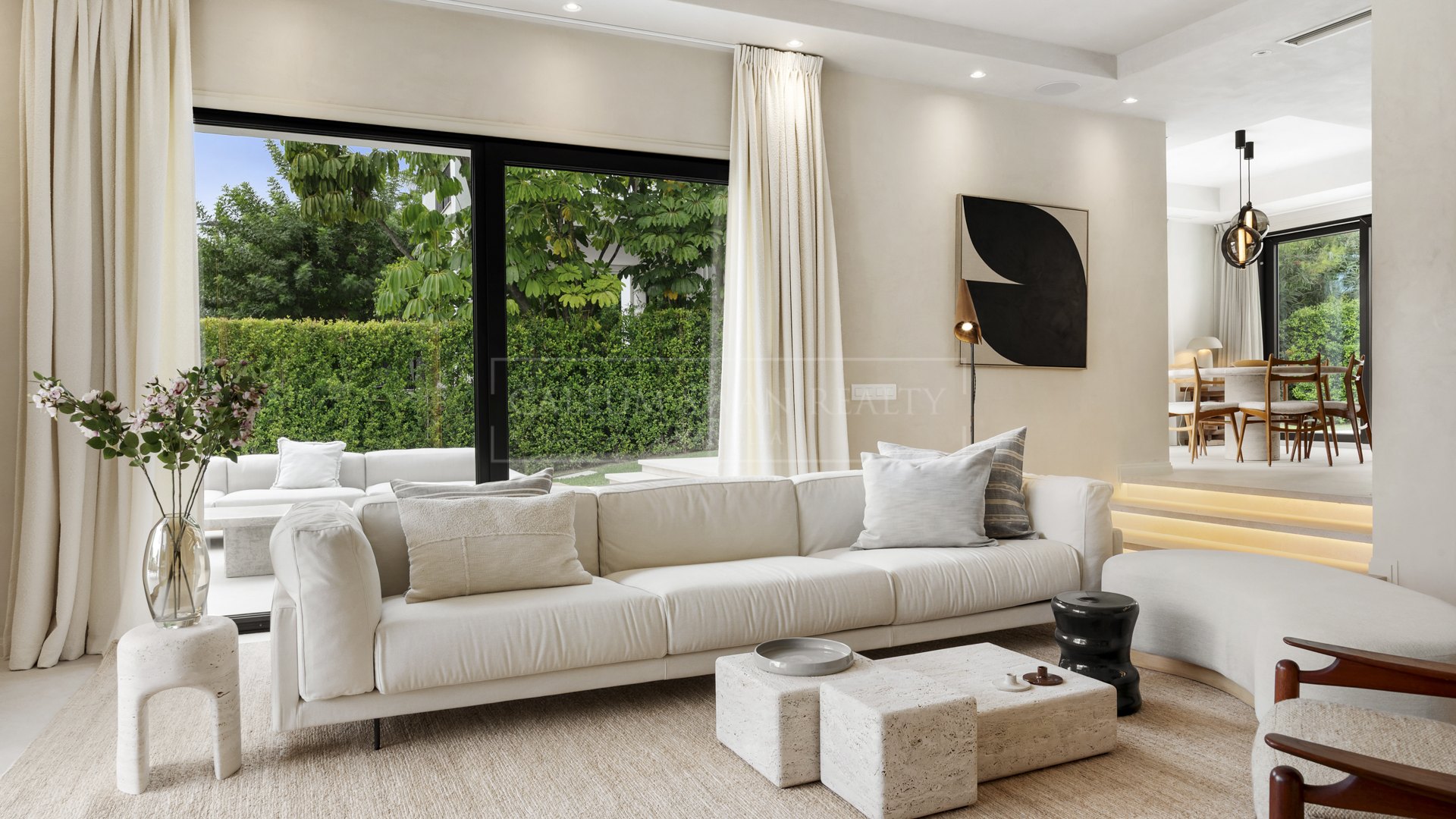 Répartie sur deux étages, la maison offre tranquillité et intimité, avec quatre chambres en suite, un grand jardin et des intérieurs bien conçus. Le rez-de-chaussée comprend un espace de vie semi-ouvert avec un salon, une salle à manger et une cuisine entièrement équipée avec des détails en bois et un passage vers le salon, le tout avec un accès direct au jardin. Des toilettes pour invités et une chambre en suite pour invités, également avec accès au jardin, complètent cet étage.