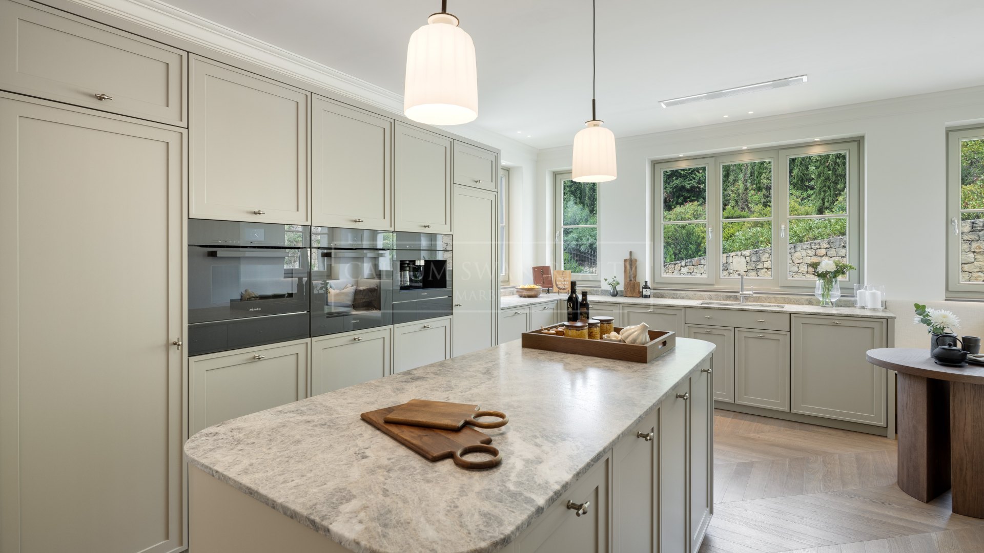 Répartie sur deux niveaux, la villa bénéficie d’une vue panoramique sur la campagne et les montagnes environnantes, ainsi que d’une variété d’espaces intérieurs et extérieurs propices à la détente et aux loisirs. Le rez-de-chaussée comprend deux halls d’entrée, l’un équipé de placards en bois et l’autre menant aux principaux espaces de vie. Le salon formel, avec ses hauts plafonds et sa cheminée, s’ouvre par des portes vitrées en arc sur le jardin, la piscine et les terrasses. À côté de cet espace se trouvent la salle à manger et une cuisine entièrement équipée avec des appareils électroménagers Miele et un coin petit-déjeuner, le tout relié à une terrasse semi-couverte avec cuisine extérieure, salle à manger et salon.