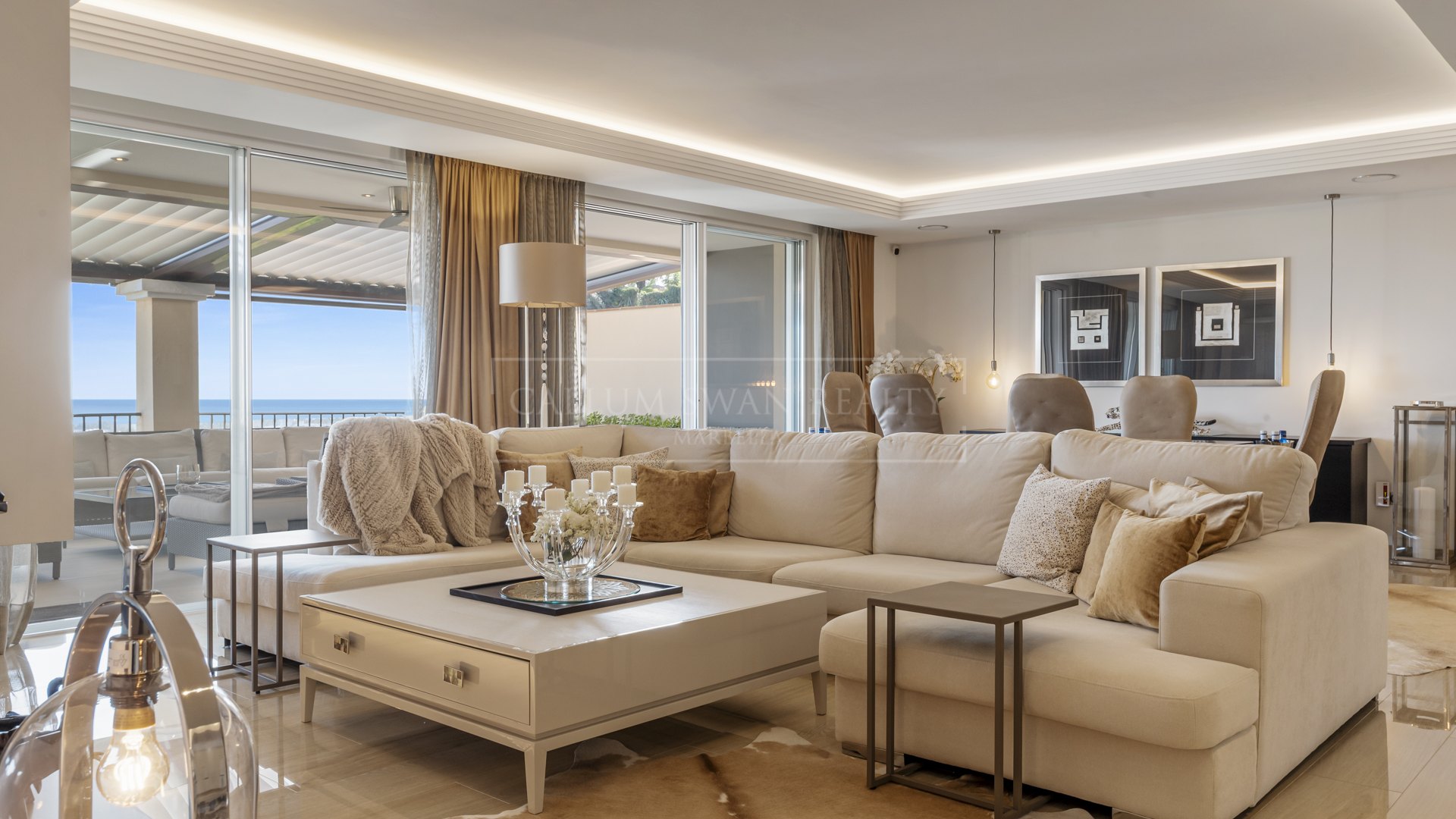 La terrasse principale combine une section couverte avec un plafond rétractable, permettant une utilisation toute l’année et offrant une vue dégagée sur la mer Méditerranée, tandis qu’une terrasse séparée propose un espace supplémentaire pour les repas en plein air.