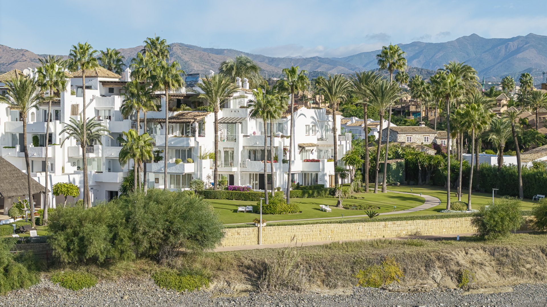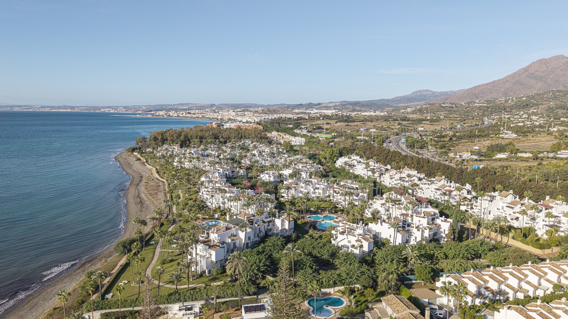 Situé sur la côte de la Nouvelle Mille d’Or, cet appartement de trois chambres se trouve au sein de la communauté fermée en bord de mer d’Alcazaba Beach à Estepona. La propriété bénéficie d’un accès direct à la plage et à la promenade, et se trouve à distance de marche du centre-ville d’Estepona, des supermarchés, des restaurants, de plusieurs écoles internationales ainsi que du La Resina Golf and Country Club. En voiture, le centre d’Estepona est à environ 10 minutes et San Pedro de Alcántara à environ 15 minutes, offrant une gamme plus large de services.