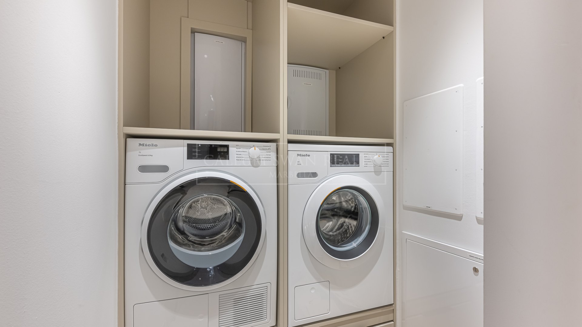 Parmi les autres caractéristiques figurent une cheminée électrique, un système audio intégré B&O, une cave à vins, un espace buanderie dissimulé, un chauffage par le sol, des toilettes japonaises, deux places de parking souterrain et un local de rangement.