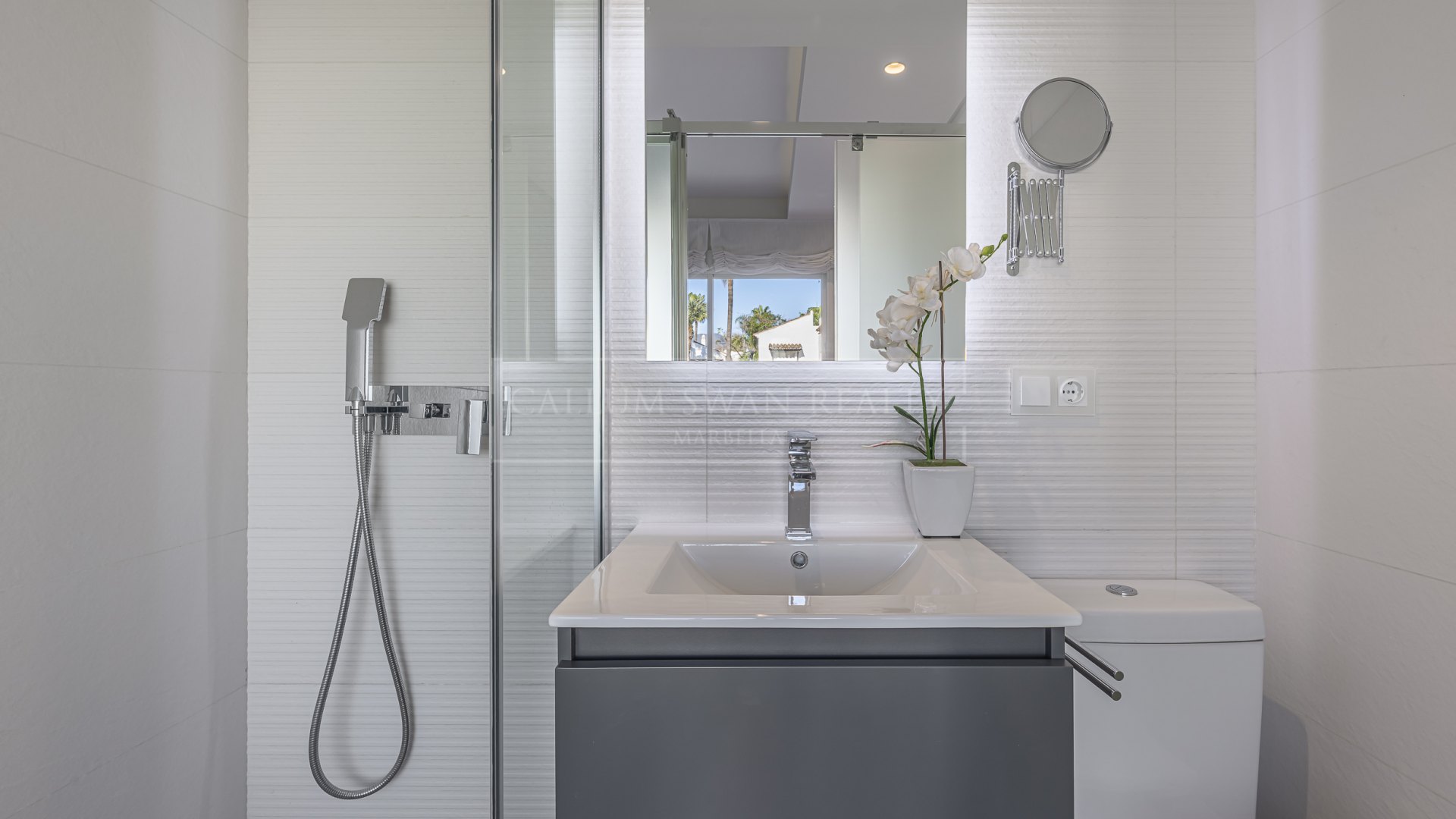 Le couloir mène à deux chambres bien proportionnées. La chambre principale bénéficie d’une vue sur la mer, d’un espace pour un lit double et d’un accès à une salle de bains située dans le couloir. La seconde chambre comprend une salle de bains privative et profite d’une vue sur le quartier résidentiel environnant. Les deux chambres disposent de solutions de rangement intégrées judicieusement pensées, améliorant la praticité du logement.