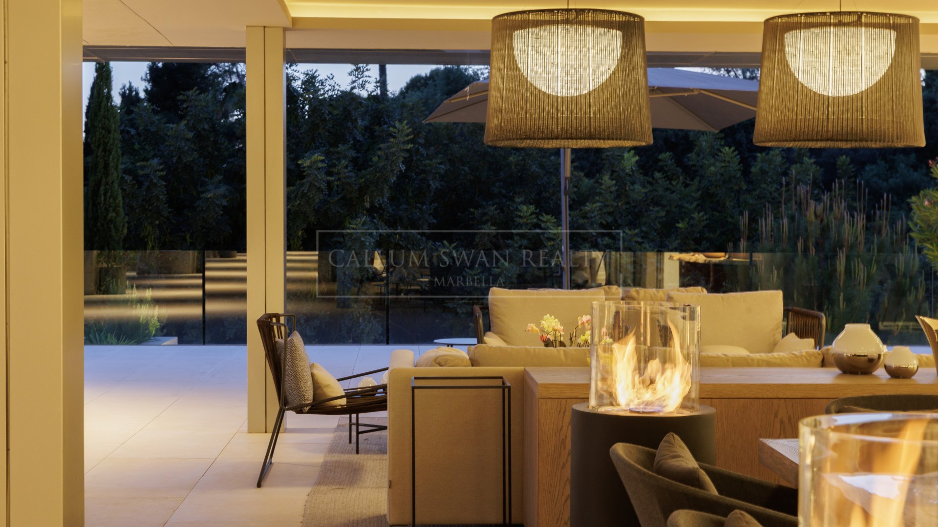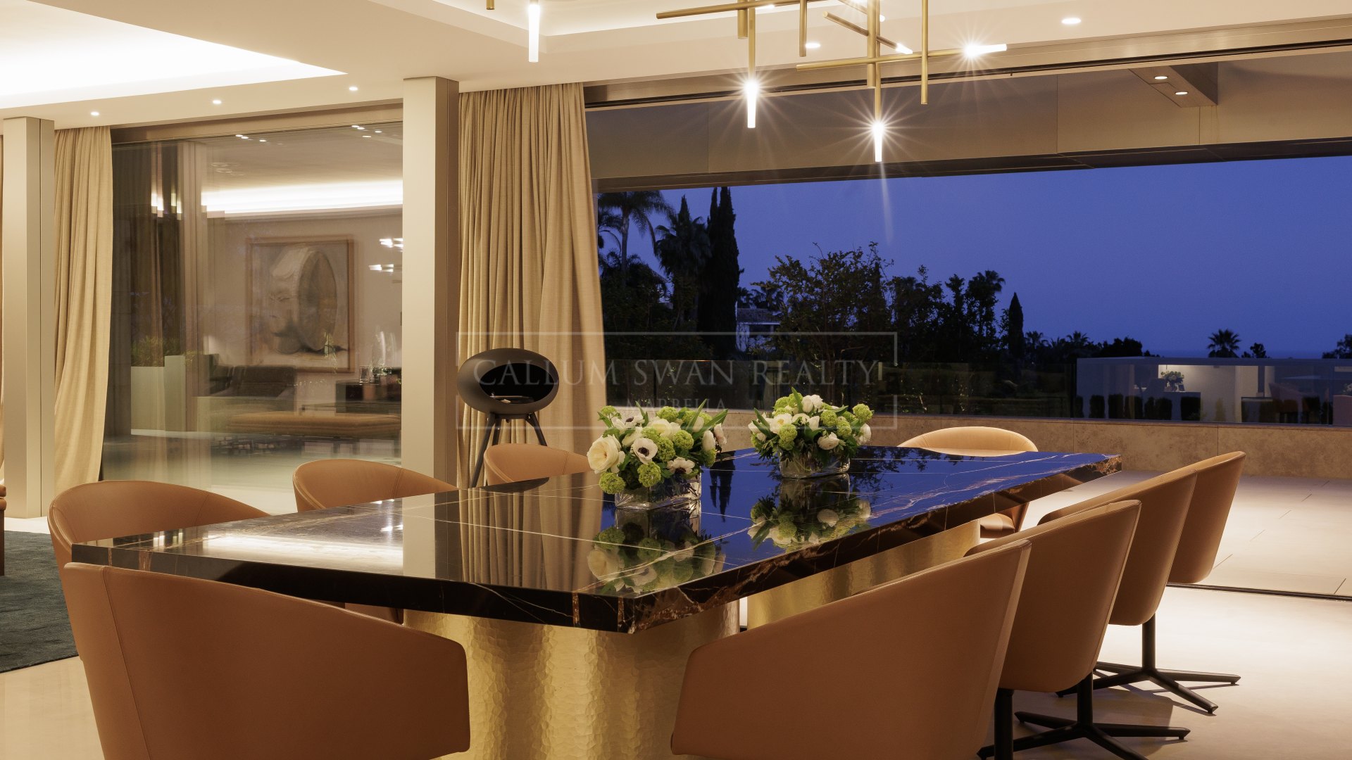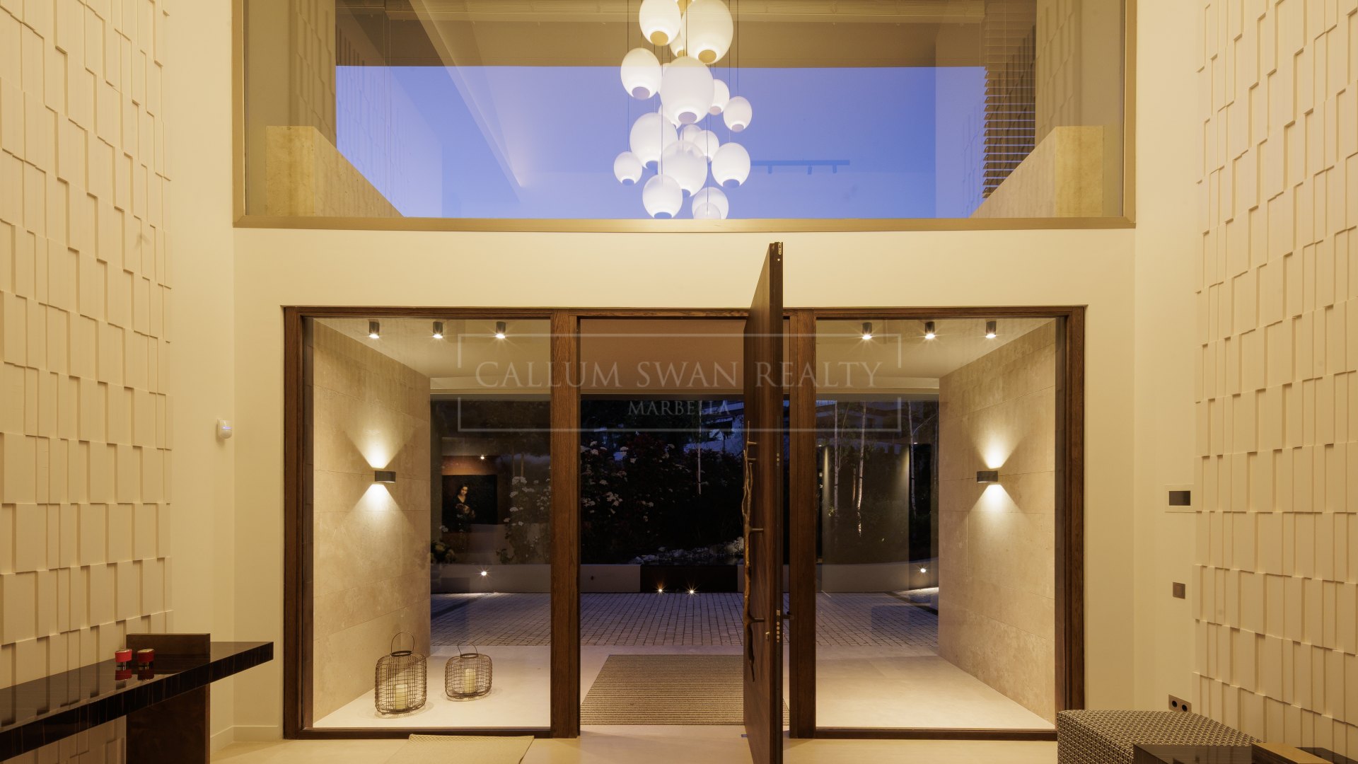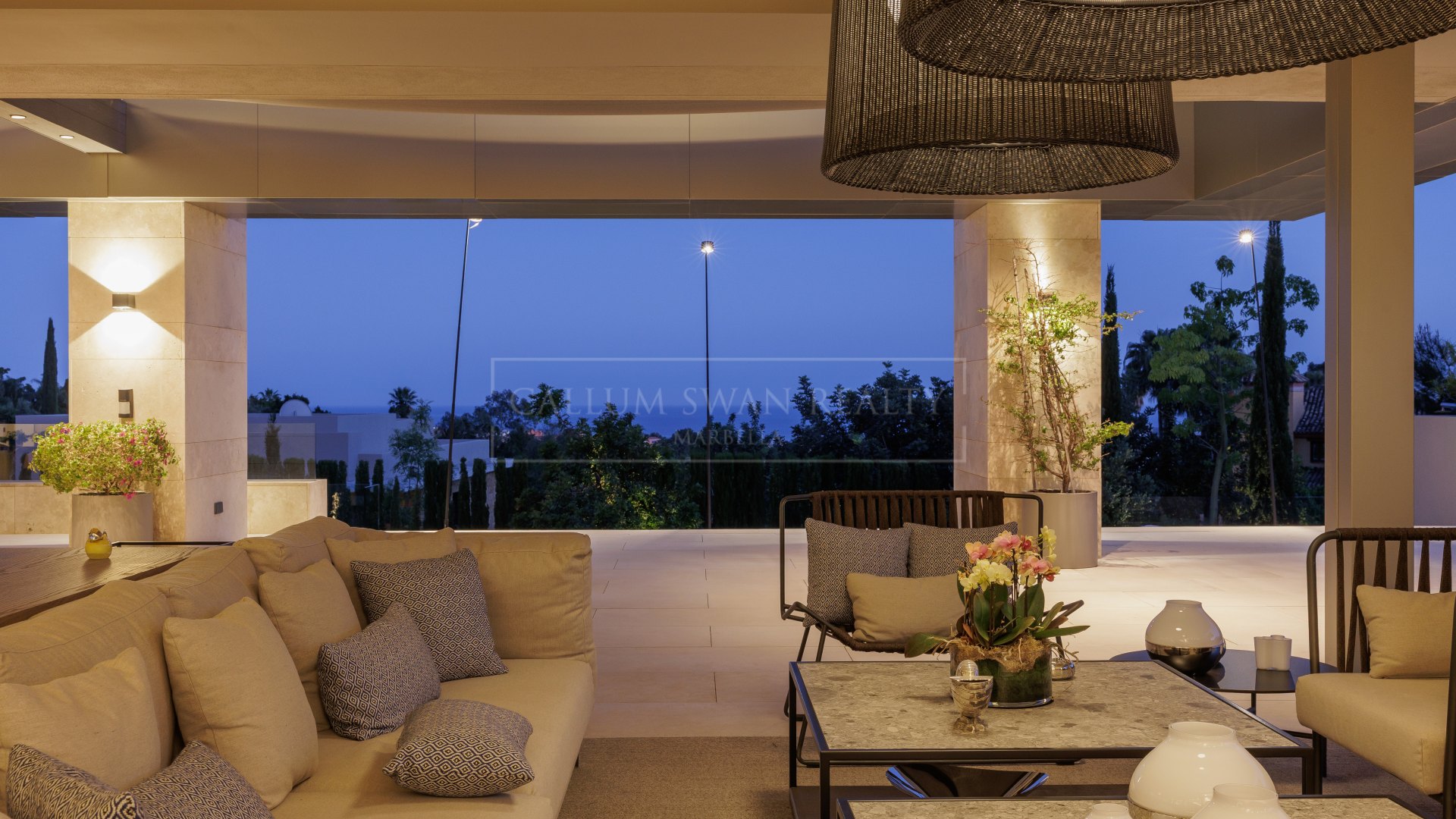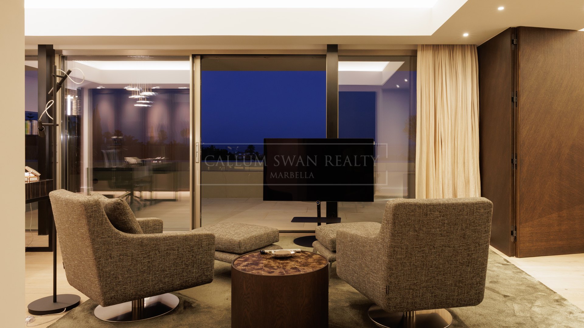Le design intérieur se prolonge sur les terrasses extérieures, idéales pour recevoir ou profiter d’un repas en plein air au bord de la piscine d’eau salée chauffée. Le bureau privé et la suite d’invités situés au rez-de-chaussée ajoutent à la fonctionnalité de l’ensemble. À l‘étage supérieur, on trouve une superbe suite principale avec dressing, salon privé et accès direct à une terrasse panoramique offrant une vue sur la mer et le cadre naturel de la Sierra Blanca. Une deuxième chambre avec salle de bains complète ce niveau, avec la possibilité d’ajouter une cinquième chambre si vous le souhaitez. Le niveau inférieur a été conçu pour être un espace spa privé avec une piscine intérieure chauffée, un sauna, une salle de sport entièrement équipée, un home cinéma, une cave à vin climatisée et une salle de divertissement. Le garage fermé pouvant accueillir cinq véhicules complète cet étage.