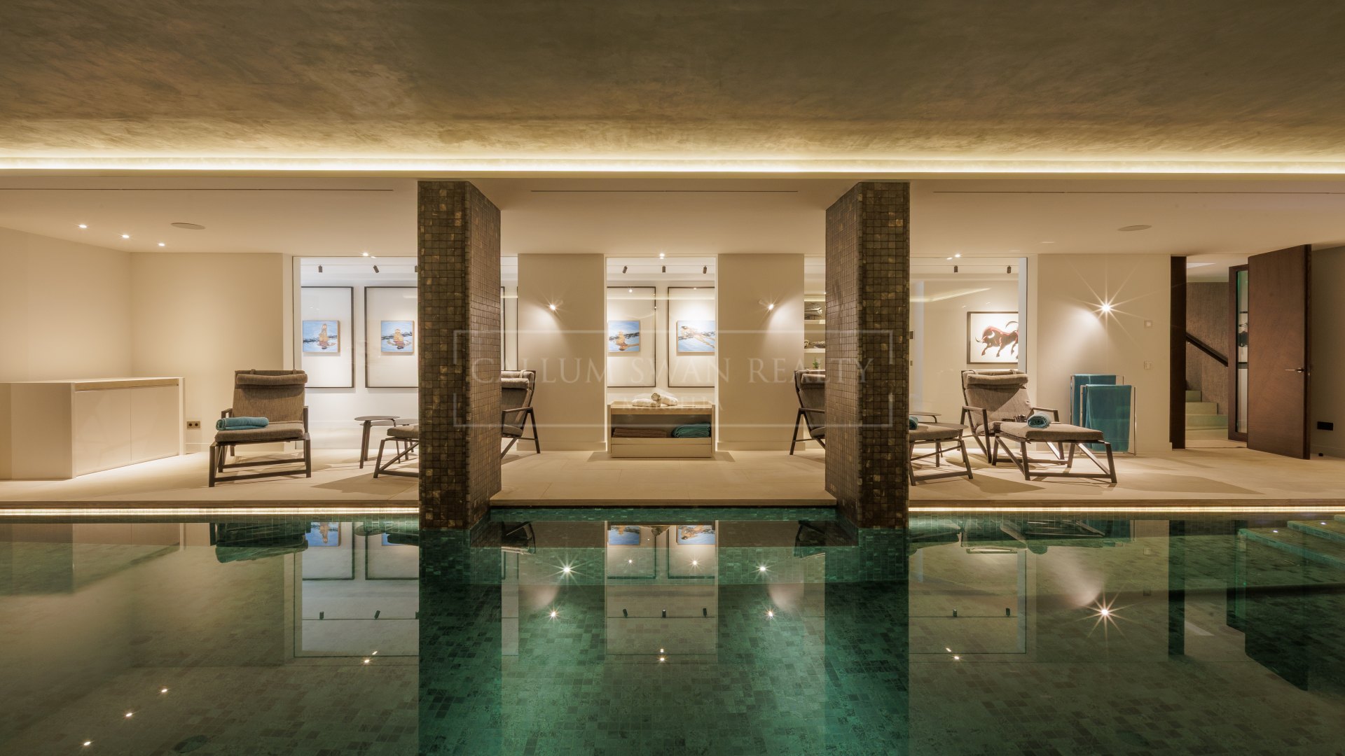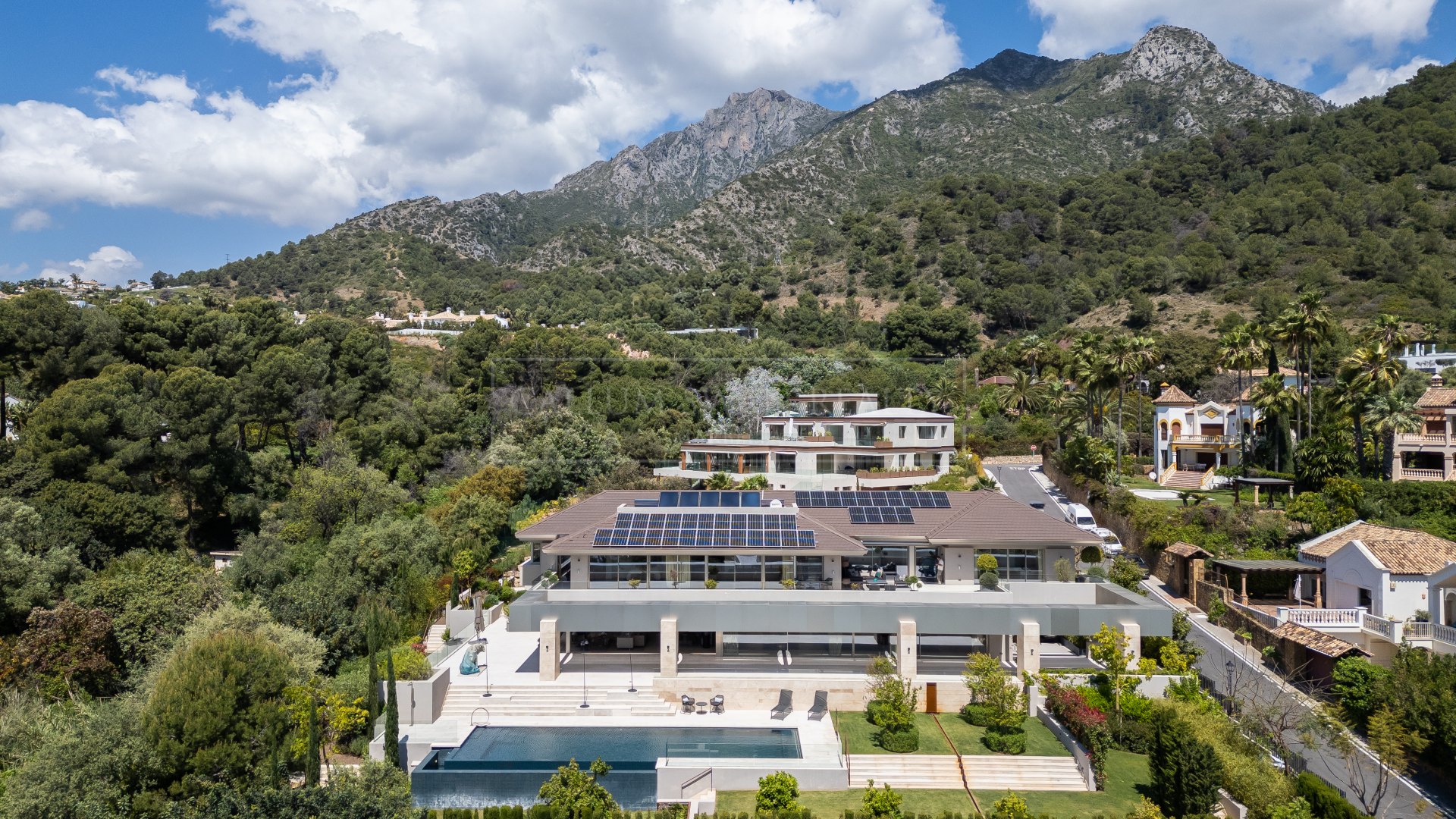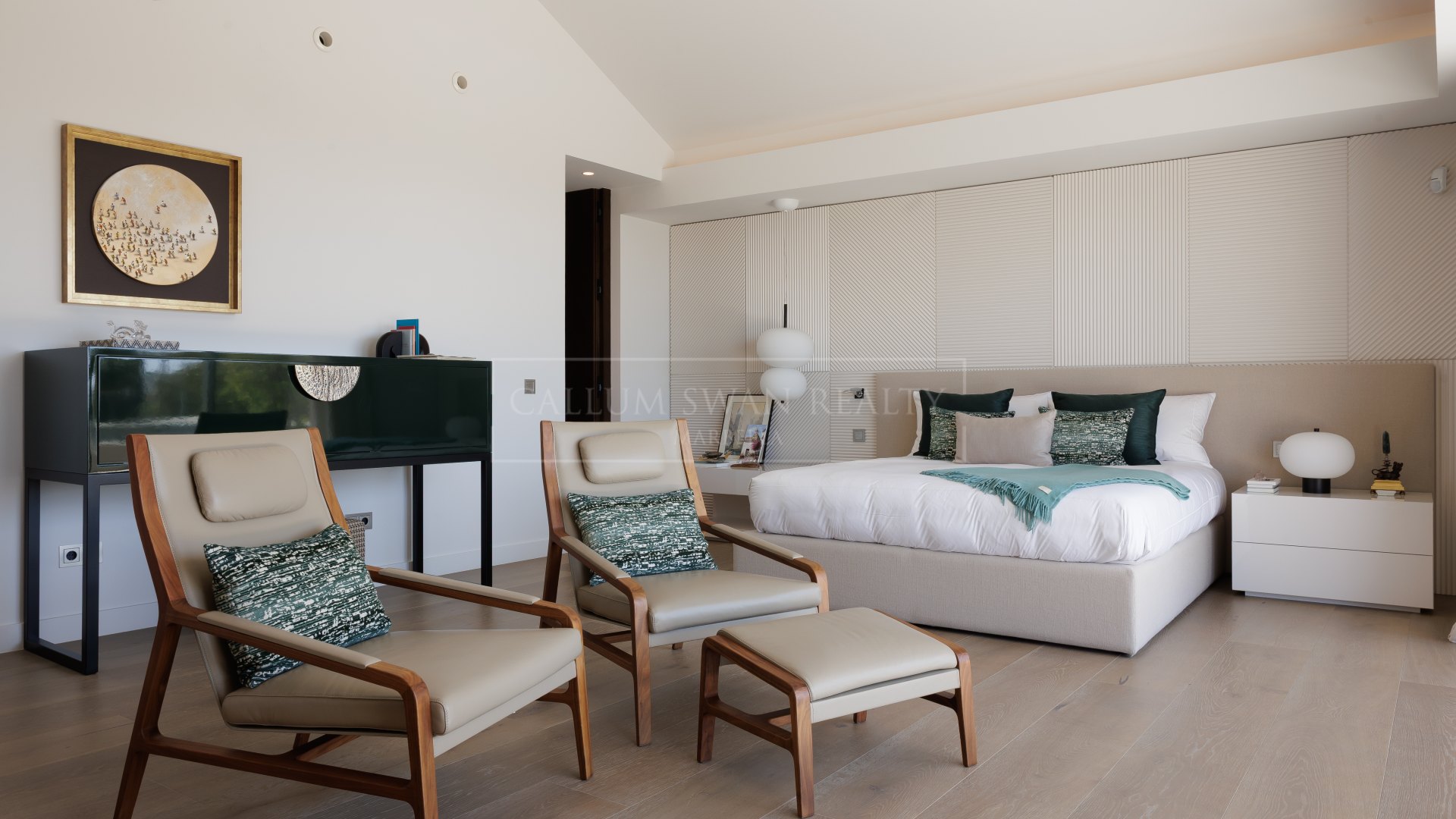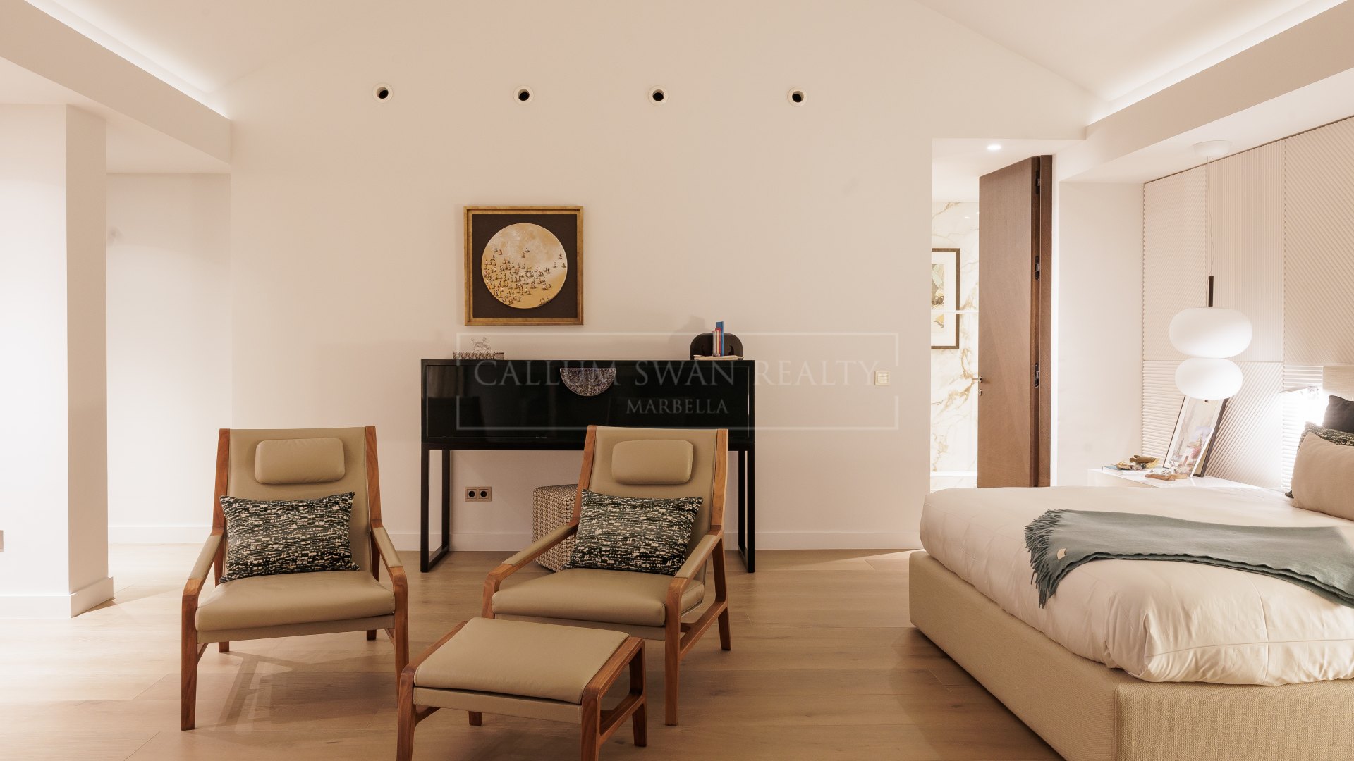 Le design intérieur se prolonge sur les terrasses extérieures, idéales pour recevoir ou profiter d’un repas en plein air au bord de la piscine d’eau salée chauffée. Le bureau privé et la suite d’invités situés au rez-de-chaussée ajoutent à la fonctionnalité de l’ensemble. À l‘étage supérieur, on trouve une superbe suite principale avec dressing, salon privé et accès direct à une terrasse panoramique offrant une vue sur la mer et le cadre naturel de la Sierra Blanca. Une deuxième chambre avec salle de bains complète ce niveau, avec la possibilité d’ajouter une cinquième chambre si vous le souhaitez. Le niveau inférieur a été conçu pour être un espace spa privé avec une piscine intérieure chauffée, un sauna, une salle de sport entièrement équipée, un home cinéma, une cave à vin climatisée et une salle de divertissement. Le garage fermé pouvant accueillir cinq véhicules complète cet étage.