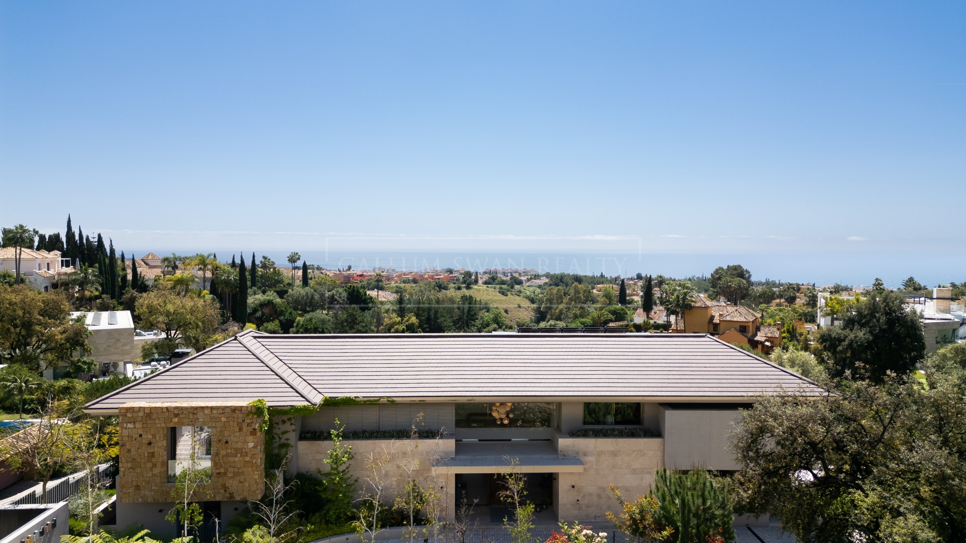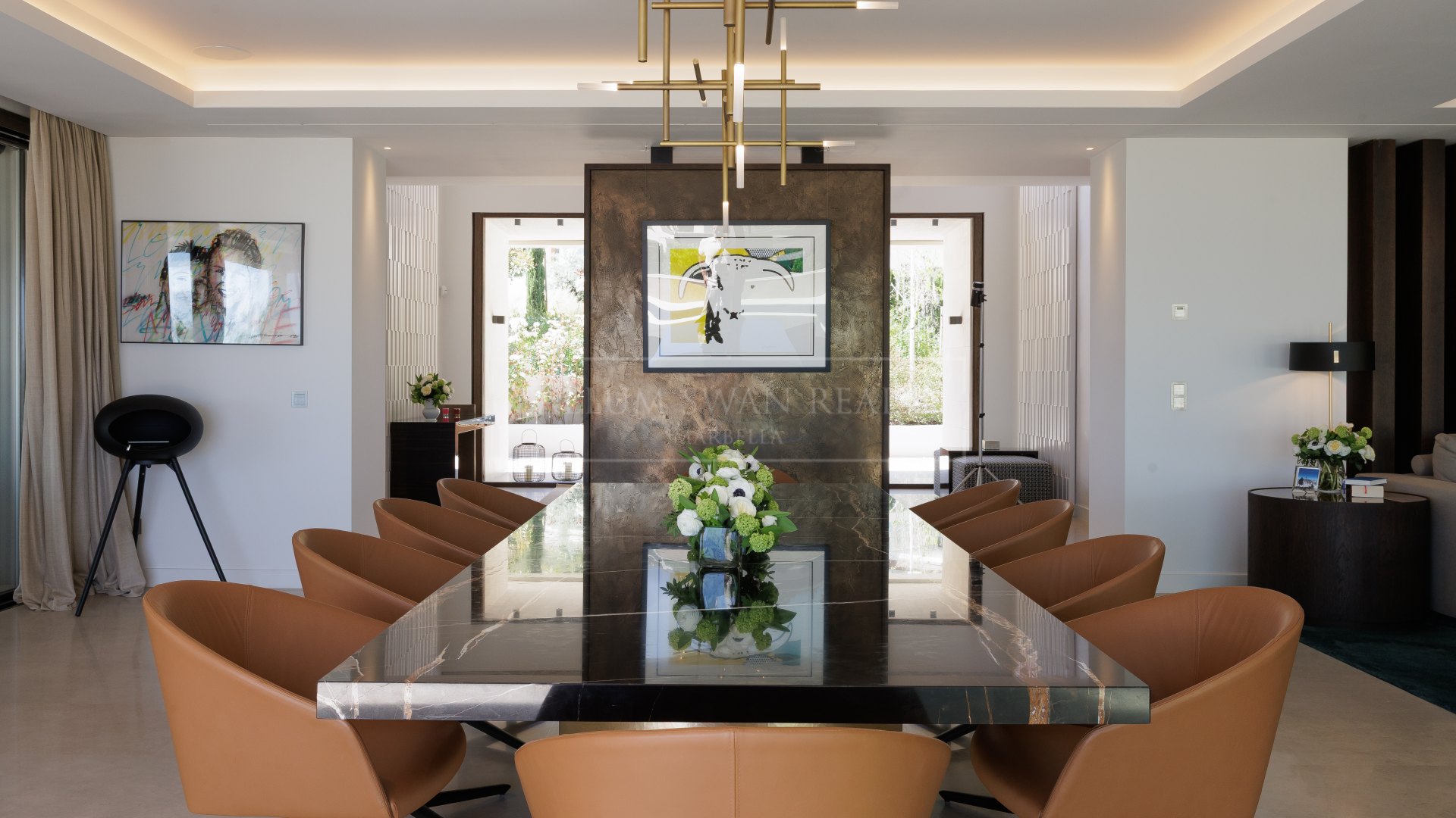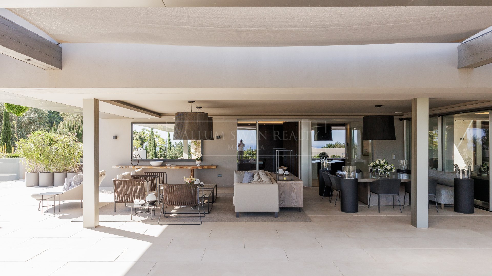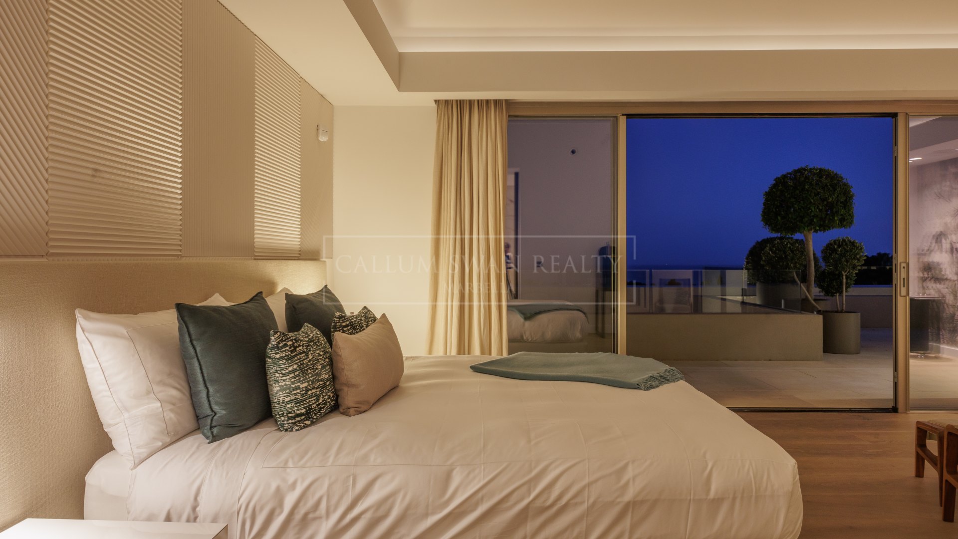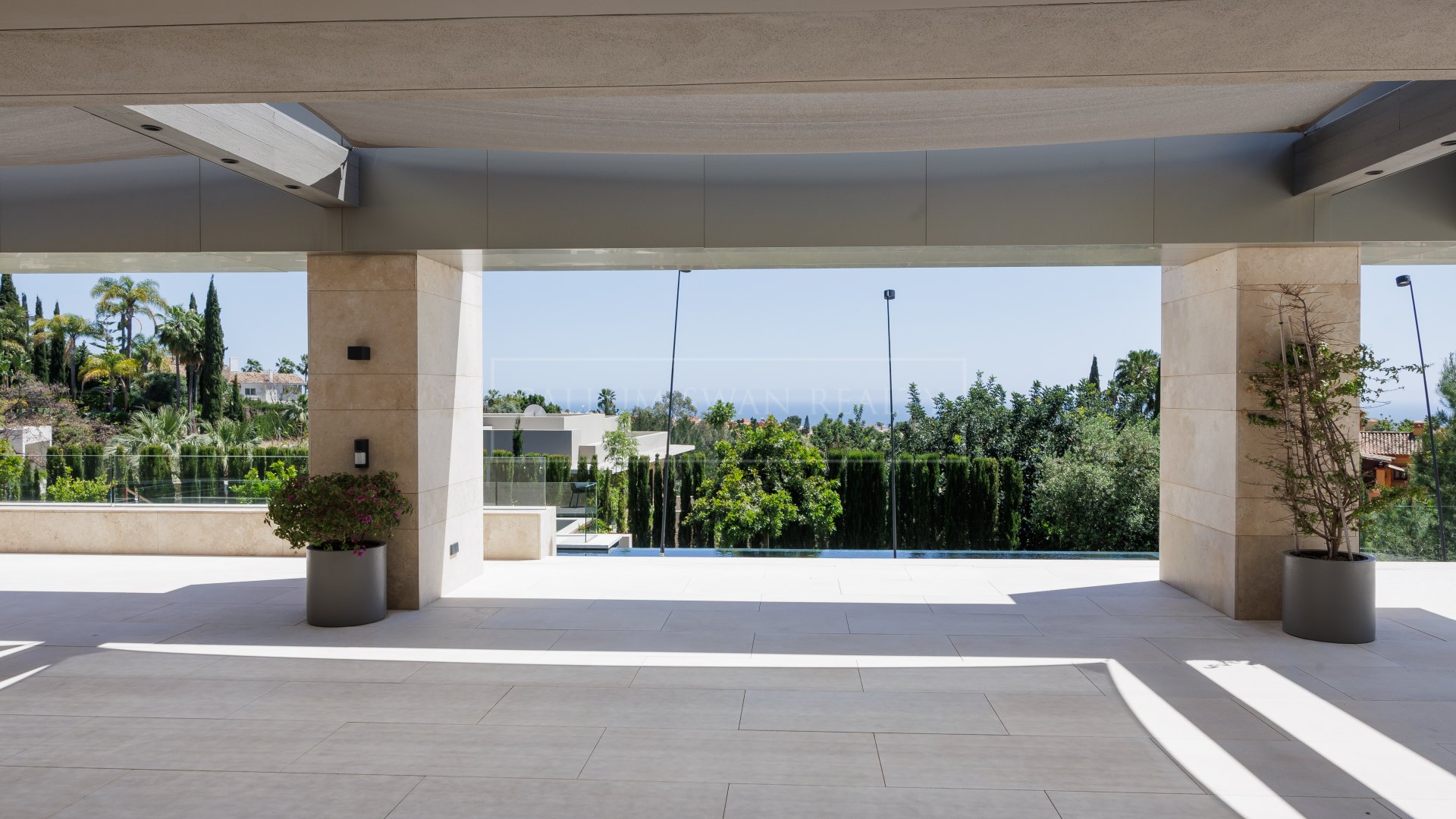 Le design intérieur se prolonge sur les terrasses extérieures, idéales pour recevoir ou profiter d’un repas en plein air au bord de la piscine d’eau salée chauffée. Le bureau privé et la suite d’invités situés au rez-de-chaussée ajoutent à la fonctionnalité de l’ensemble. À l‘étage supérieur, on trouve une superbe suite principale avec dressing, salon privé et accès direct à une terrasse panoramique offrant une vue sur la mer et le cadre naturel de la Sierra Blanca. Une deuxième chambre avec salle de bains complète ce niveau, avec la possibilité d’ajouter une cinquième chambre si vous le souhaitez. Le niveau inférieur a été conçu pour être un espace spa privé avec une piscine intérieure chauffée, un sauna, une salle de sport entièrement équipée, un home cinéma, une cave à vin climatisée et une salle de divertissement. Le garage fermé pouvant accueillir cinq véhicules complète cet étage.