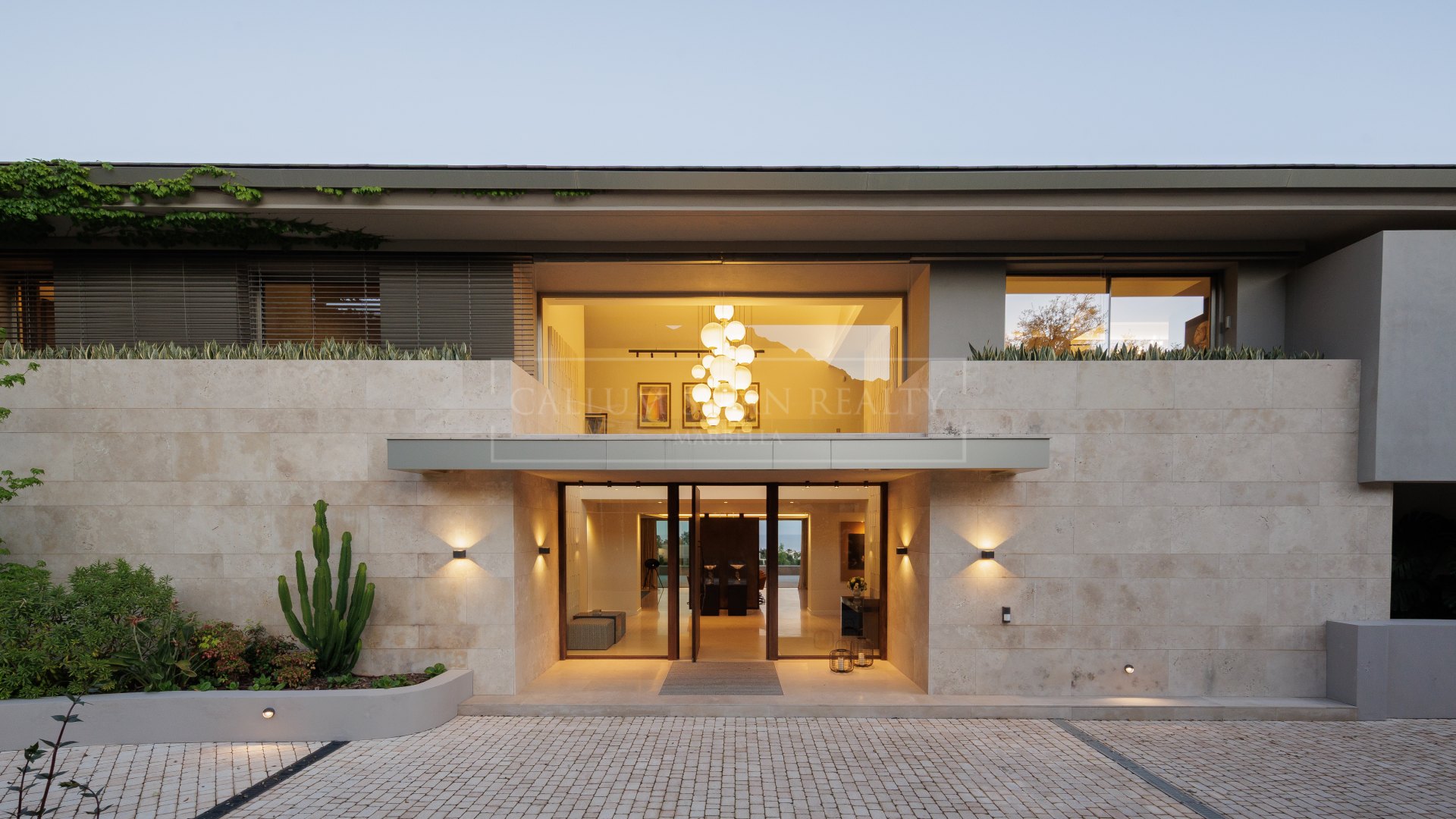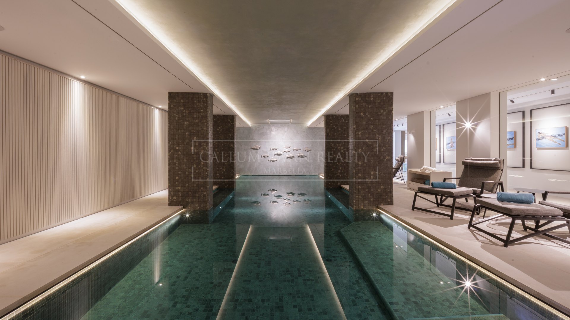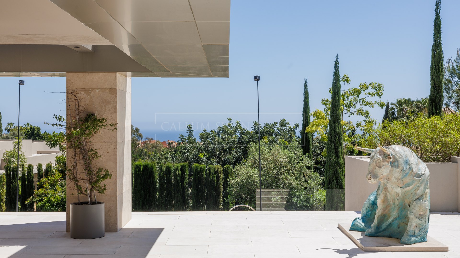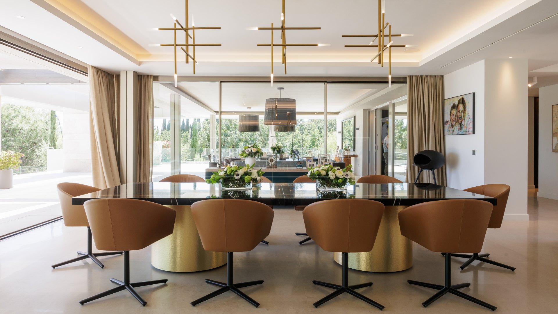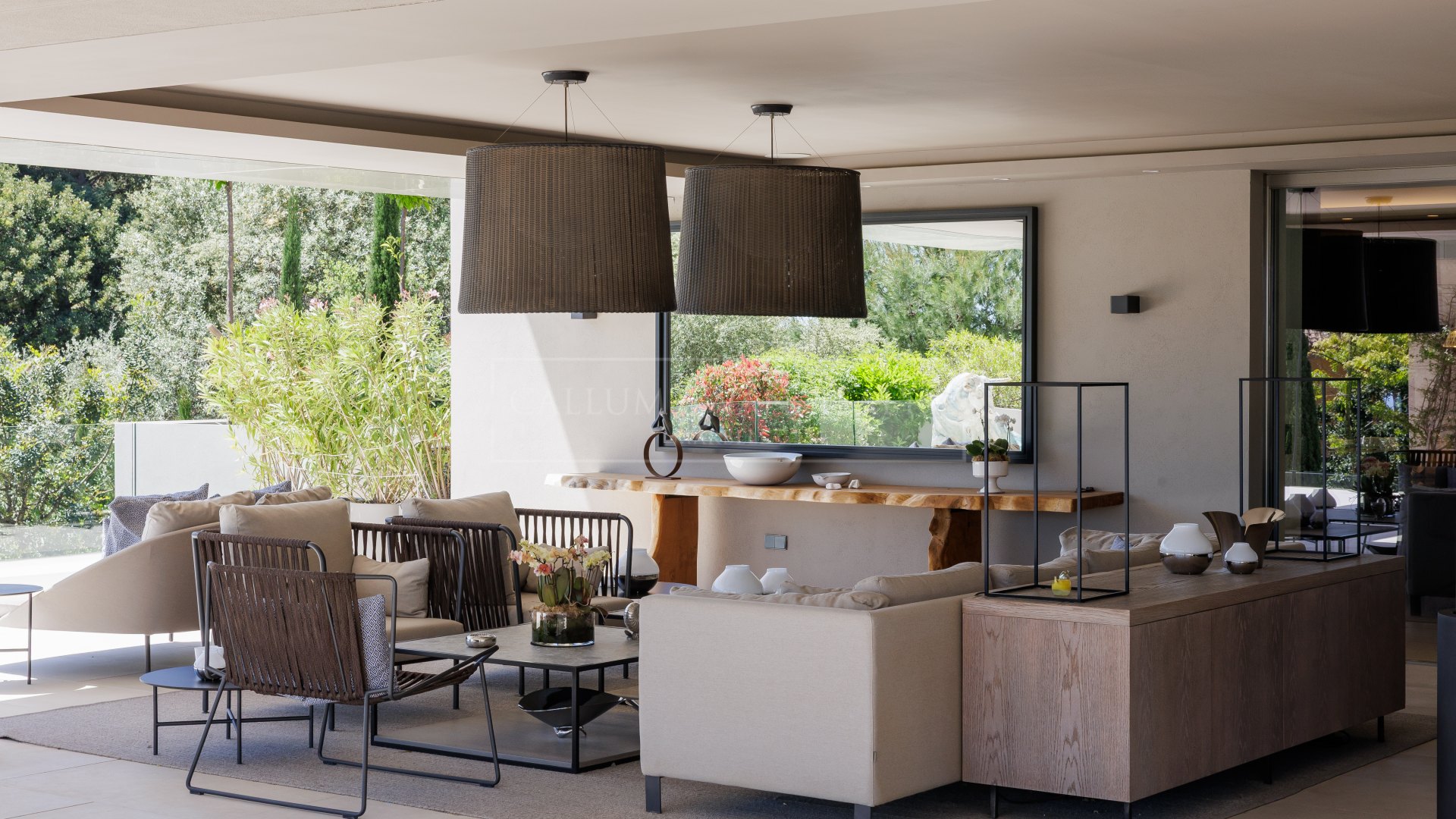 Le design intérieur se prolonge sur les terrasses extérieures, idéales pour recevoir ou profiter d’un repas en plein air au bord de la piscine d’eau salée chauffée. Le bureau privé et la suite d’invités situés au rez-de-chaussée ajoutent à la fonctionnalité de l’ensemble. À l‘étage supérieur, on trouve une superbe suite principale avec dressing, salon privé et accès direct à une terrasse panoramique offrant une vue sur la mer et le cadre naturel de la Sierra Blanca. Une deuxième chambre avec salle de bains complète ce niveau, avec la possibilité d’ajouter une cinquième chambre si vous le souhaitez. Le niveau inférieur a été conçu pour être un espace spa privé avec une piscine intérieure chauffée, un sauna, une salle de sport entièrement équipée, un home cinéma, une cave à vin climatisée et une salle de divertissement. Le garage fermé pouvant accueillir cinq véhicules complète cet étage.