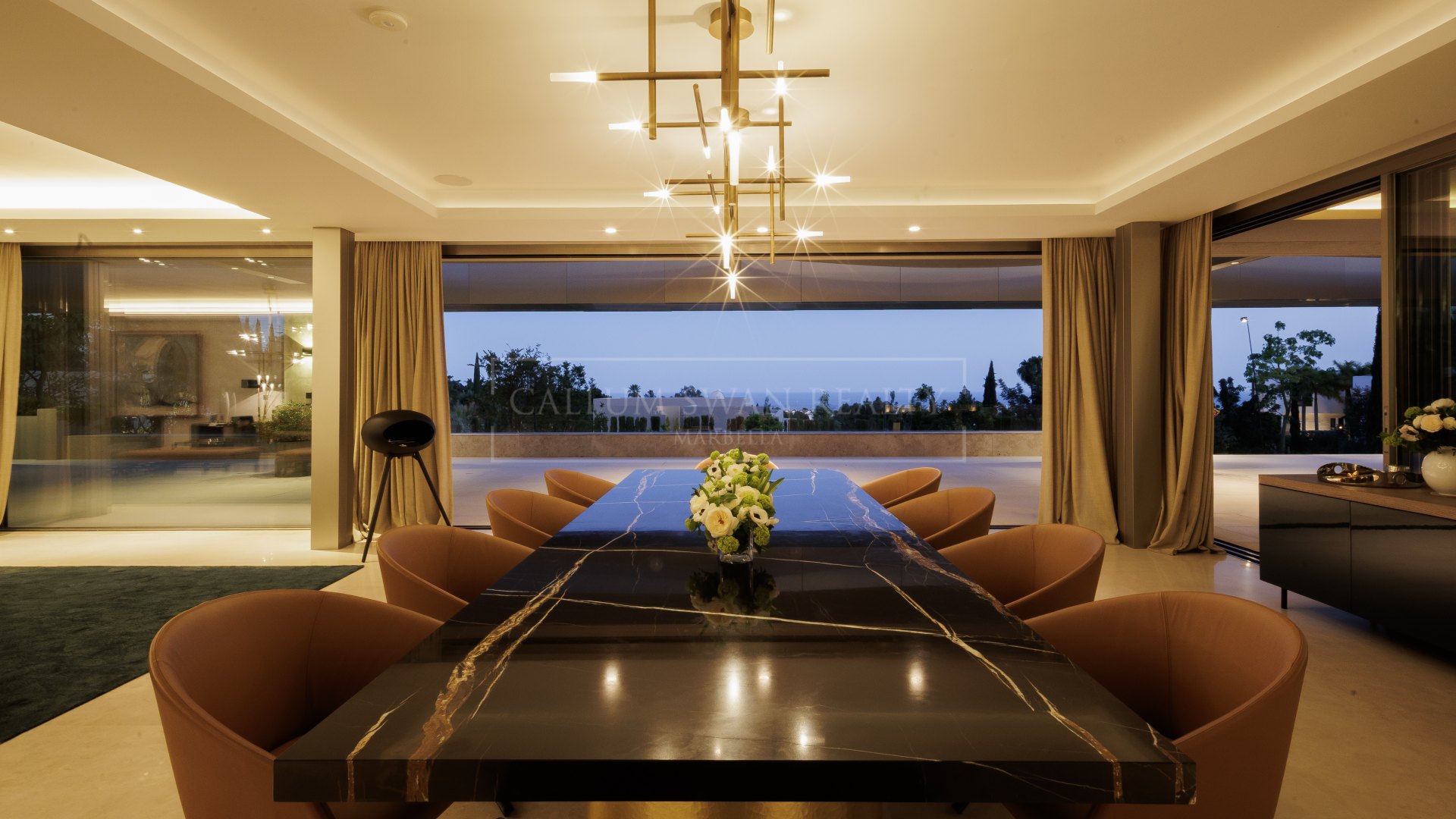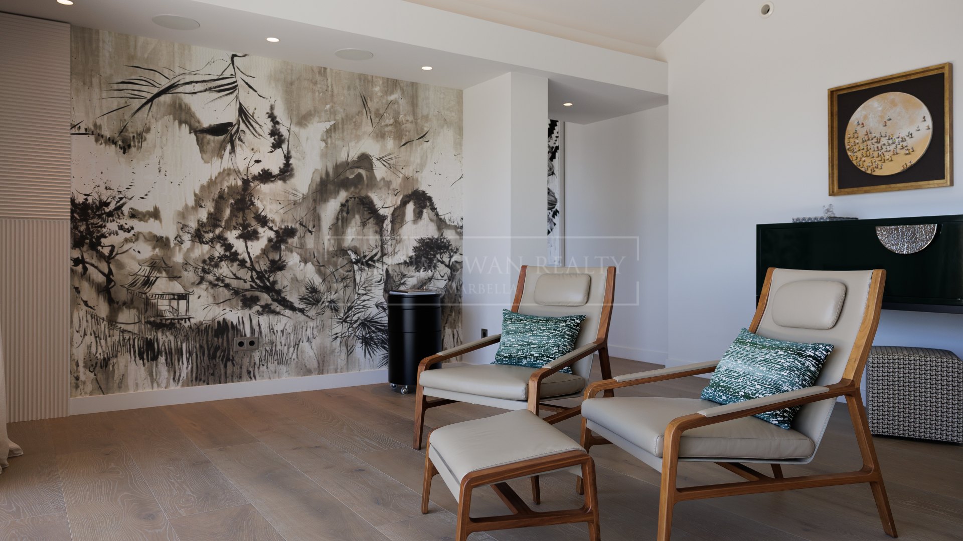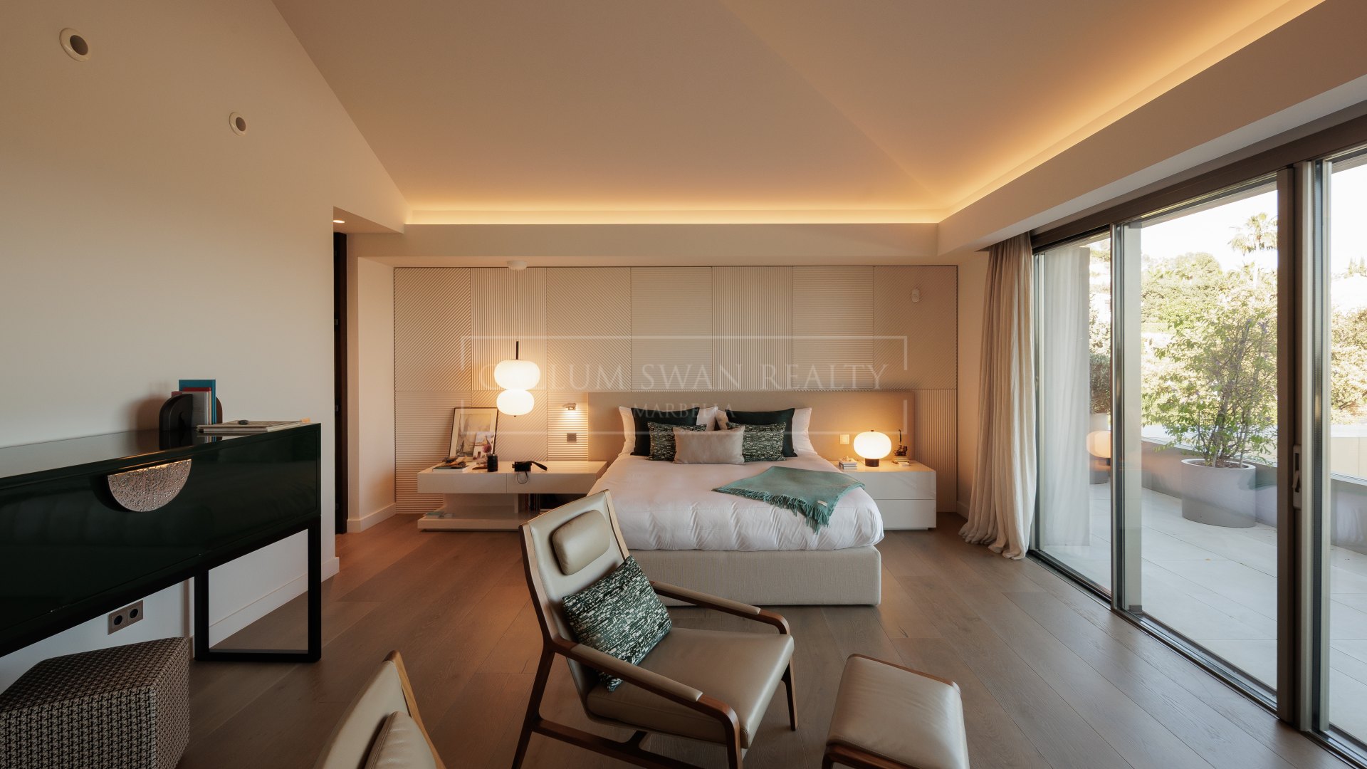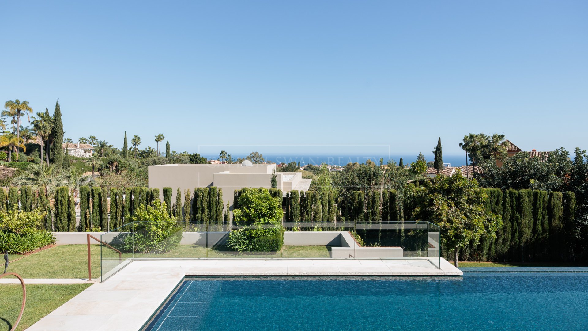 Le design intérieur se prolonge sur les terrasses extérieures, idéales pour recevoir ou profiter d’un repas en plein air au bord de la piscine d’eau salée chauffée. Le bureau privé et la suite d’invités situés au rez-de-chaussée ajoutent à la fonctionnalité de l’ensemble. À l‘étage supérieur, on trouve une superbe suite principale avec dressing, salon privé et accès direct à une terrasse panoramique offrant une vue sur la mer et le cadre naturel de la Sierra Blanca. Une deuxième chambre avec salle de bains complète ce niveau, avec la possibilité d’ajouter une cinquième chambre si vous le souhaitez. Le niveau inférieur a été conçu pour être un espace spa privé avec une piscine intérieure chauffée, un sauna, une salle de sport entièrement équipée, un home cinéma, une cave à vin climatisée et une salle de divertissement. Le garage fermé pouvant accueillir cinq véhicules complète cet étage.