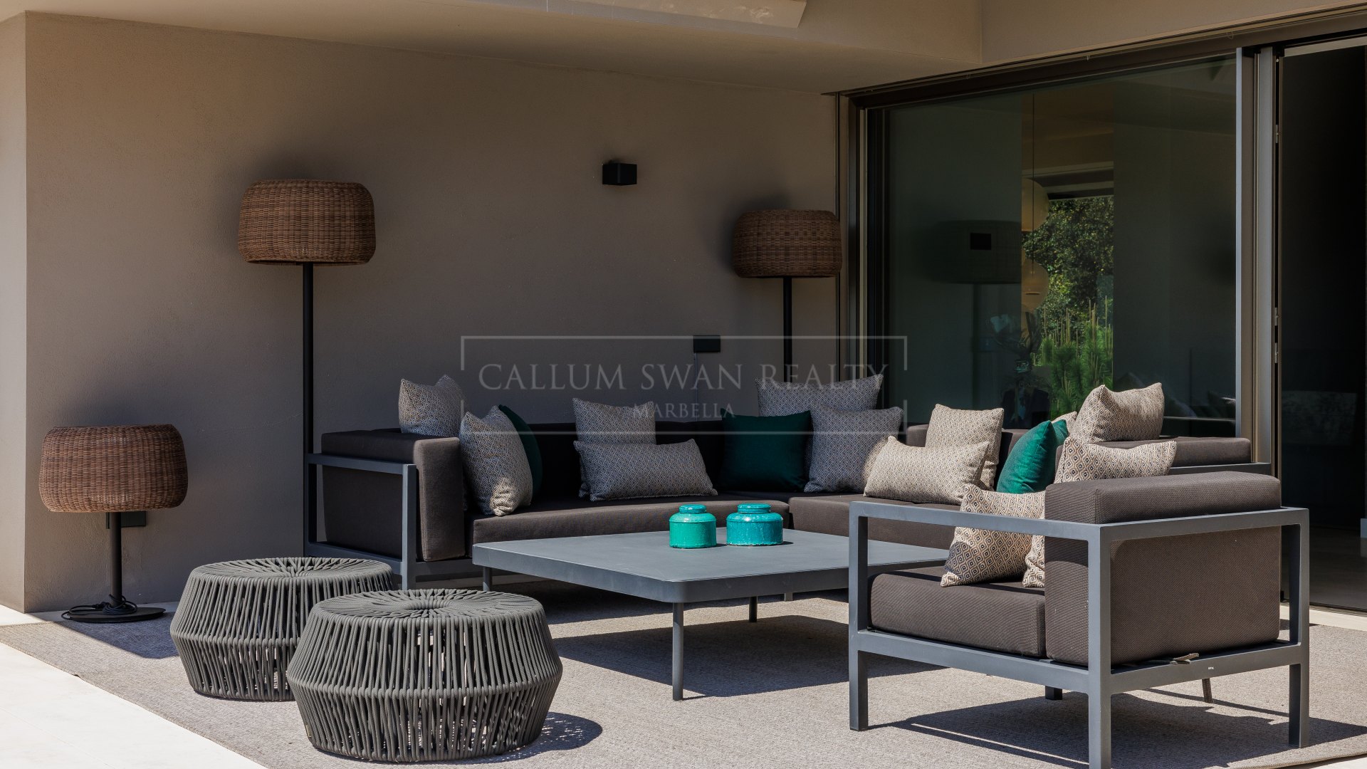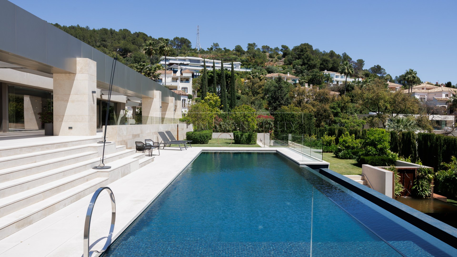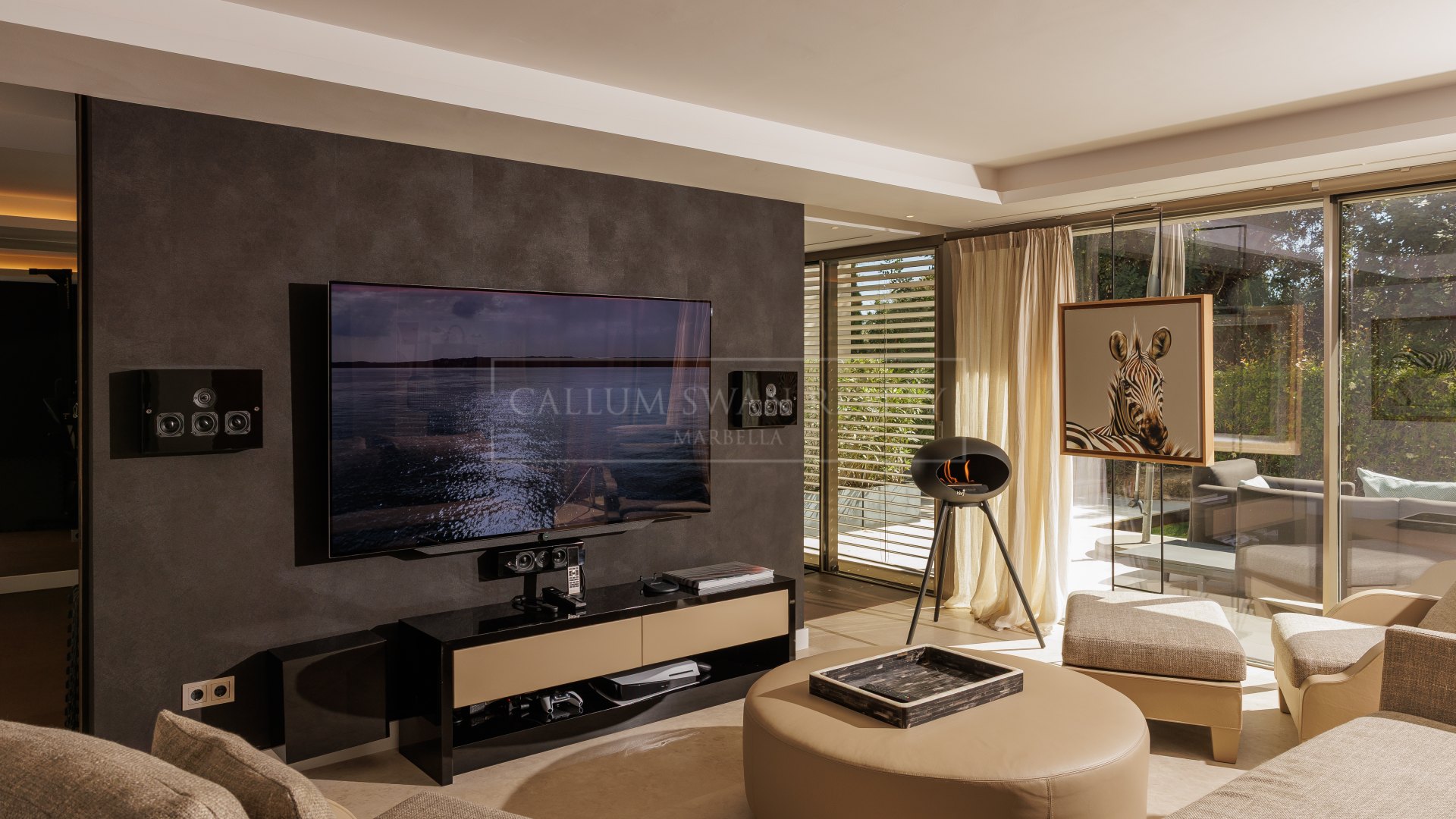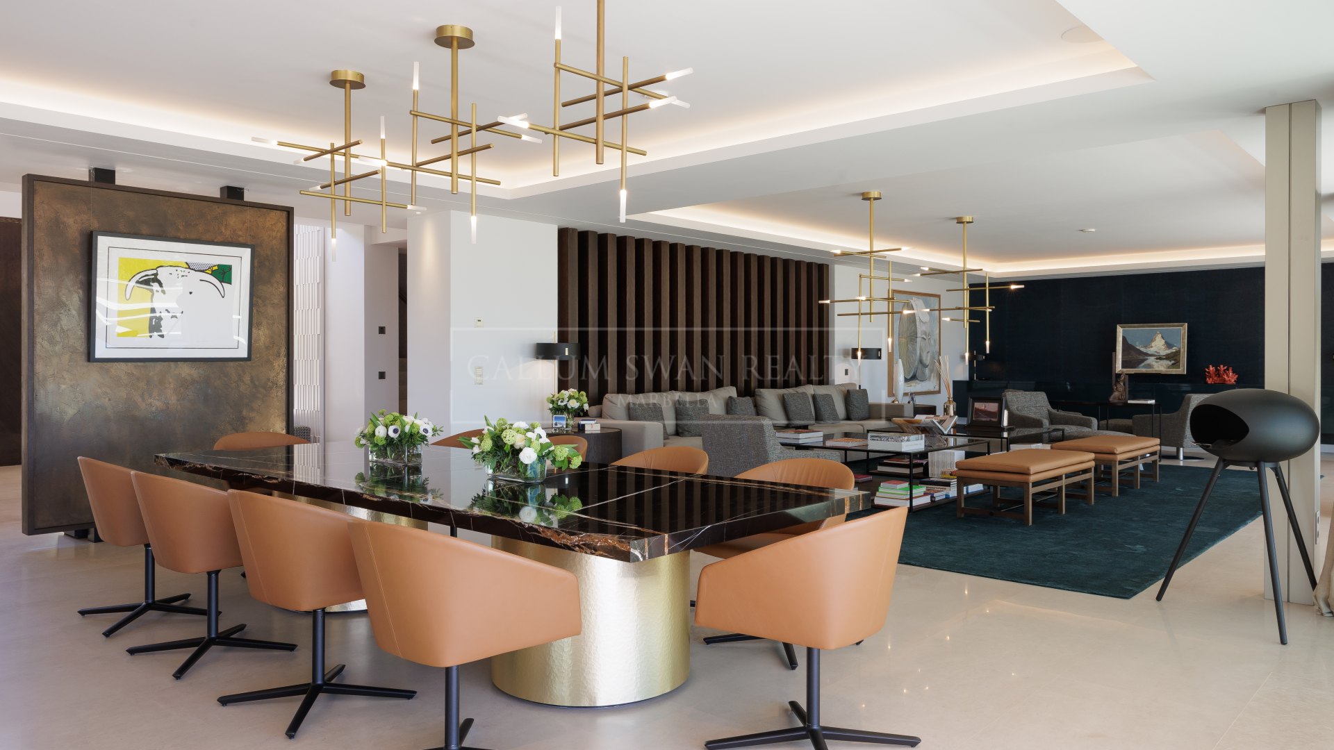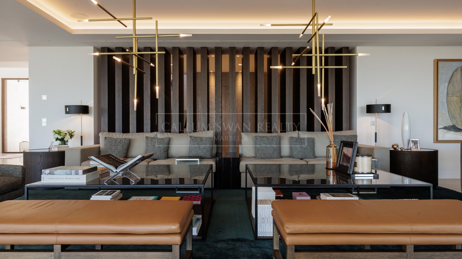 Le design intérieur se prolonge sur les terrasses extérieures, idéales pour recevoir ou profiter d’un repas en plein air au bord de la piscine d’eau salée chauffée. Le bureau privé et la suite d’invités situés au rez-de-chaussée ajoutent à la fonctionnalité de l’ensemble. À l‘étage supérieur, on trouve une superbe suite principale avec dressing, salon privé et accès direct à une terrasse panoramique offrant une vue sur la mer et le cadre naturel de la Sierra Blanca. Une deuxième chambre avec salle de bains complète ce niveau, avec la possibilité d’ajouter une cinquième chambre si vous le souhaitez. Le niveau inférieur a été conçu pour être un espace spa privé avec une piscine intérieure chauffée, un sauna, une salle de sport entièrement équipée, un home cinéma, une cave à vin climatisée et une salle de divertissement. Le garage fermé pouvant accueillir cinq véhicules complète cet étage.
