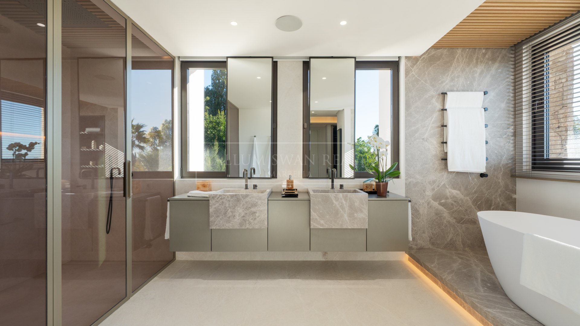 Le premier étage abrite la suite principale, comprenant un dressing, une salle de bains attenante et une terrasse privée. Deux autres chambres d’invités avec salle de bains attenante ainsi qu’un bureau indépendant sont également disposés à cet étage.