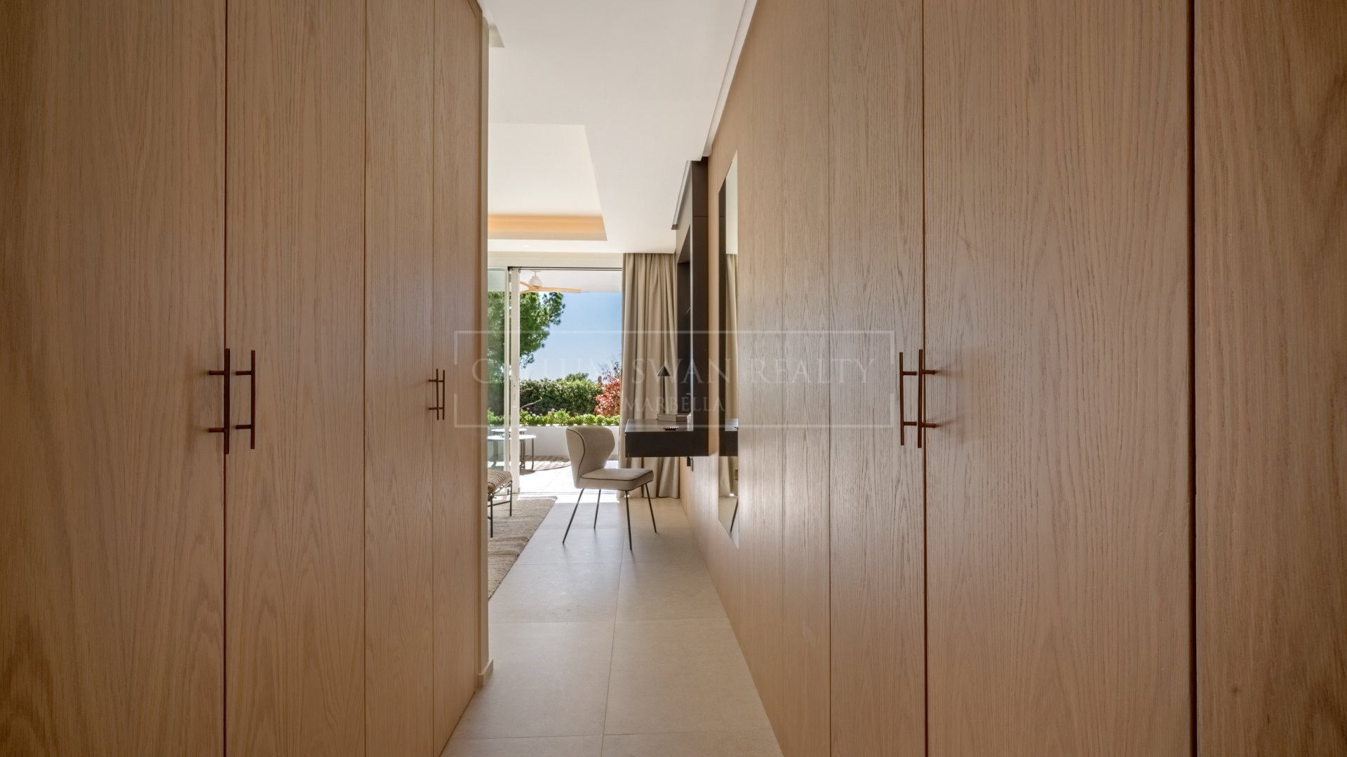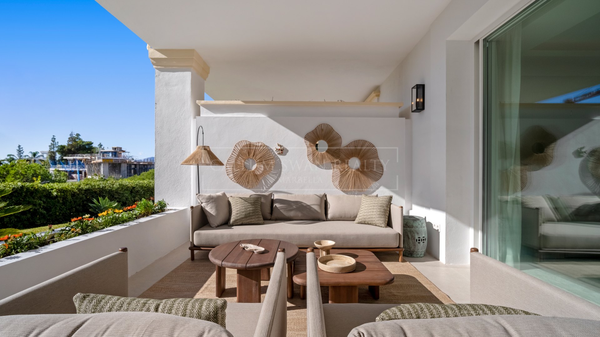 La terrasse prolonge l’espace de vie à l’extérieur et mène directement aux jardins communs et à la piscine. Des zones couvertes permettent une utilisation toute l’année, avec suffisamment d’espace pour manger et se détendre tout en préservant un bon niveau d’intimité. La vue sur les jardins renforce la sensation d’ouverture sans affecter la sécurité ni la fonctionnalité.