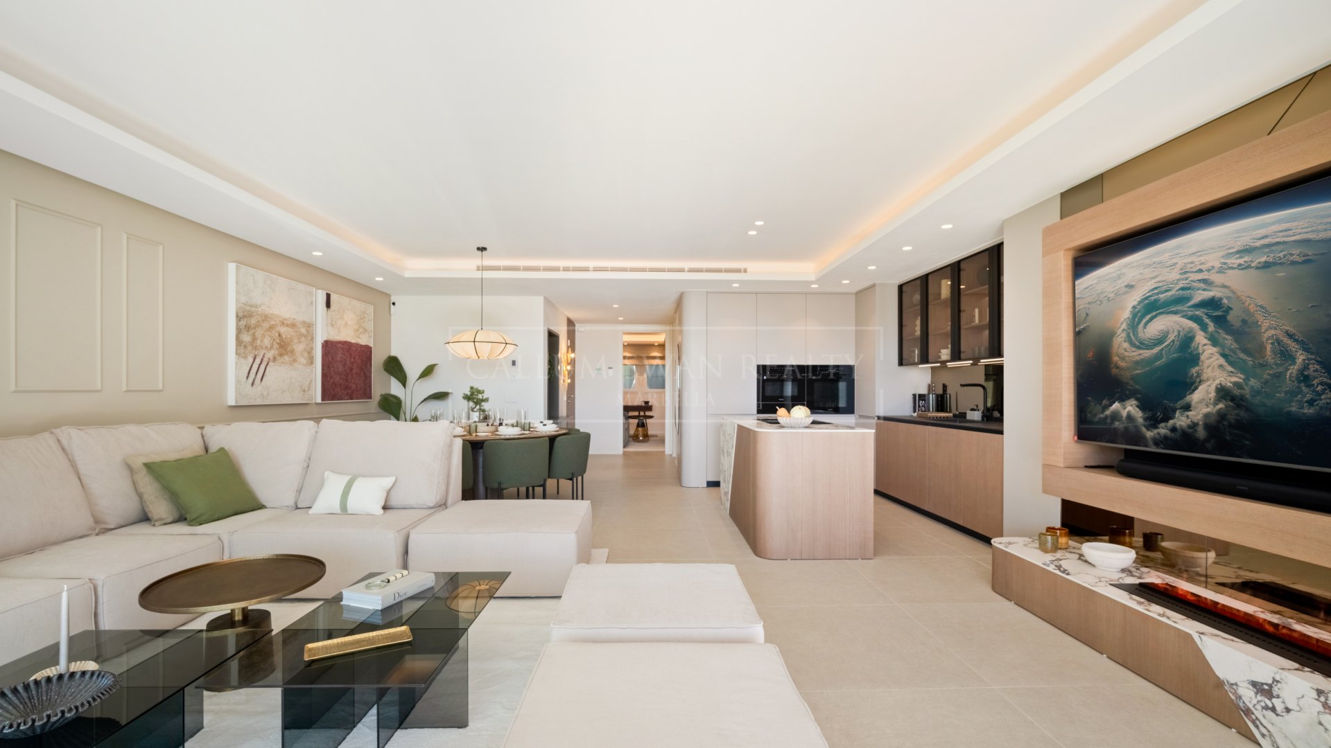 L’appartement est disposé sur un seul niveau et a été entièrement rénové. Un hall d’entrée s’ouvre sur un vaste espace de vie, salle à manger et cuisine en plan ouvert, où de grandes baies vitrées coulissantes offrent une excellente lumière naturelle et un accès direct à la terrasse. La cuisine est entièrement équipée avec des appareils intégrés, un grand espace de rangement et un îlot central adapté à un usage quotidien et à des réceptions informelles.
