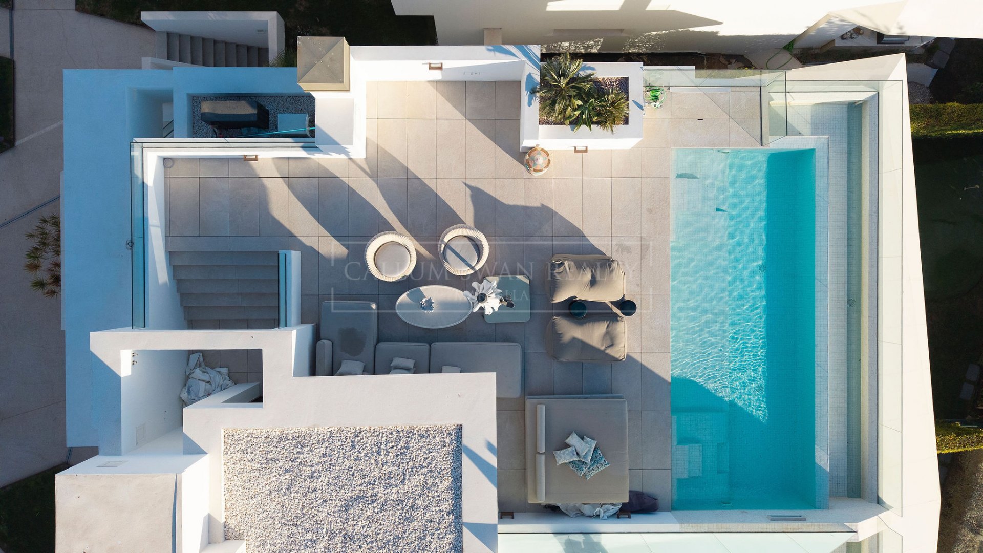 Le solarium sur le toit offre un espace extérieur supplémentaire avec un coin lounge, une piscine à débordement et des vues panoramiques sur la montagne La Concha et la mer Méditerranée.