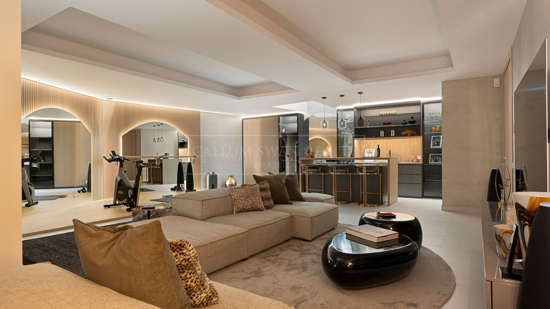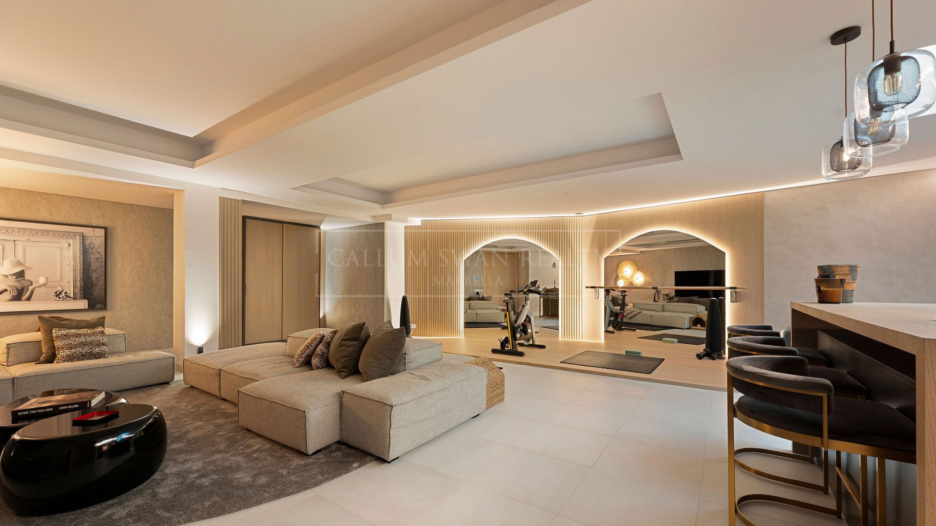 Le niveau inférieur abrite la dernière chambre d’hôtes avec salle de bains séparée, ainsi qu’un espace de divertissement comprenant un bar, une salle de sport et un salon TV. Ce niveau comprend également un local de rangement et une buanderie dédiés, ainsi qu’un garage privé pour trois voitures.