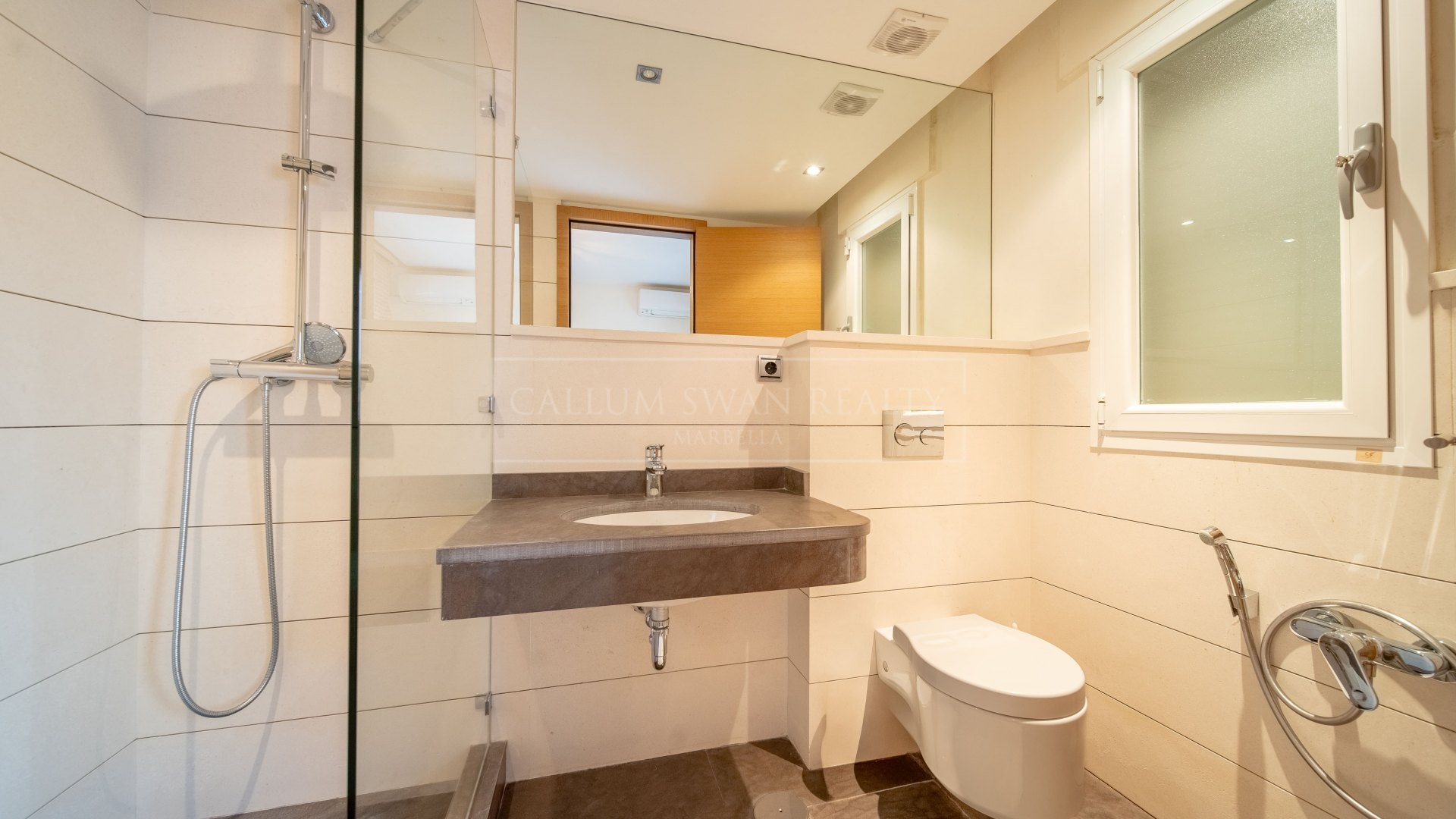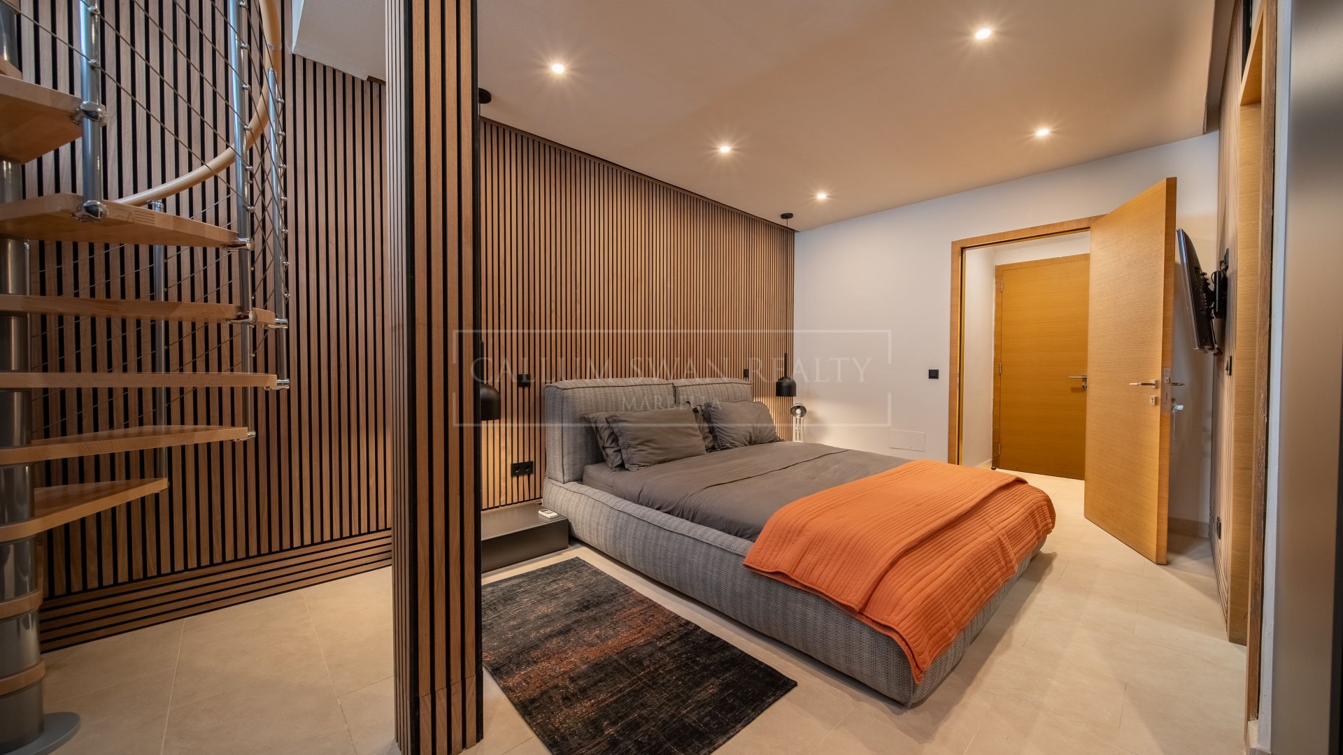L’étage supérieur est dédié à la suite principale, qui comprend un salon privé, un dressing et une salle de bain attenante. Ce niveau dispose également d’une terrasse privée avec jacuzzi et vue dégagée vers la mer. Une pièce supplémentaire à cet étage peut servir de bureau à domicile ou de salle multimédia.