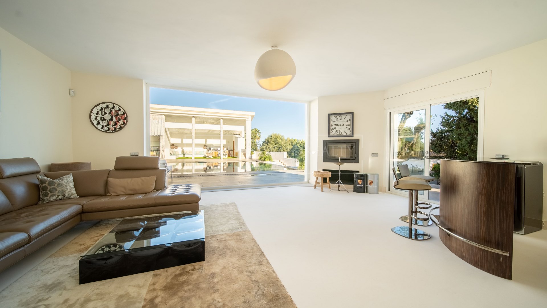 La terrasse principale mène à une piscine privée, un jacuzzi et des espaces de bronzage environnants. Un salon couvert extérieur et une salle à manger offrent de l’ombre toute l’année, tandis que le jardin paysager entoure la propriété, garantissant intimité et espace extérieur fonctionnel.